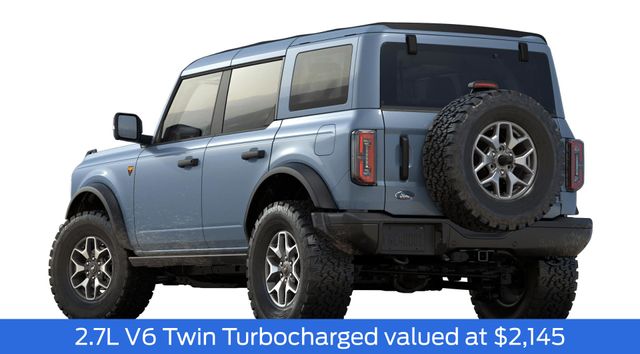 2025 Azure Gray Metallic Tri-Coat 2025 Ford Bronco Badlands Badlands 4D Sport Utility 4WD 2.7L EcoBoost V6 4D Sport Utility, 2.7L EcoBoost V6, 10-Speed Automatic, 4WD, 12" LCD Productivity Touchscreen, 360-Degree Camera, 360-Degree Camera, Adaptive Cruise Control, Adaptive Cruise Control, Auto Emergency Braking, Auto LED Headlights, Backup Camera, Body Color-Painted Hard Top, Equipment Group 334A Lux Package, Evasive Steering Assist, Front Parking Sensors, Hard Top Sound Deadening Headliner, Hill Start Assist, Information on Demand Panel, Integrated roll-over protection, Leather Seats, Pre Collision Assist w/ AEB, Push Button Start, Radio: B&O Sound System by Bang & Olufsen, Rear-Window Defroster & Washer, Remote Start, Sideview Mirrors, Trailer Tow Package (DIO), Universal Garage Door Opener. Equipment Group 334A Lux Package (360-Degree Camera, Adaptive Cruise Control, Evasive Steering Assist, Front Parking Sensors, Information on Demand Panel, Radio: B&O Sound System by Bang & Olufsen, Sideview Mirrors, Universal Garage Door Opener, and Connected Navigation), Trailer Tow Package (DIO), 4D Sport Utility, 2.7L EcoBoost V6, 10-Speed Automatic, 4WD, 12" LCD Productivity Touchscreen, 360-Degree Camera, Adaptive Cruise Control, Auto Emergency Braking, Auto LED Headlights, Backup Camera, Body Color-Painted Hard Top, Hard Top Sound Deadening Headliner, Hill Start Assist, Integrated roll-over protection, Leather Seats, Pre Collision Assist w/ AEB, Push Button Start, Rear-Window Defroster & Washer, Remote Start, 4-Wheel Disc Brakes, 4.7 Axle Ratio, 7 Speakers, ABS brakes, Air Conditioning, Alloy wheels, AM/FM radio: SiriusXM with 360L, AM/FM Stereo, Auto High-beam Headlights, Auto-dimming Rear-View mirror, Brake assist, Compass, Delay-off headlights, Driver door bin, Driver vanity mirror, Dual front impact airbags, Dual front side impact airbags, Electronic Stability Control, Emergency communication system: 911 Assist, Exterior Parking Camera Rear, Front anti-roll bar, Front Bucket Seats, Front Center Armrest, Front fog lights, Front reading lights, Front wheel independent suspension, Fully automatic headlights, Heated door mirrors, Heated front seats, Heated steering wheel, Illuminated entry, Leather Shift Knob, Leather-Trimmed/Vinyl Bucket Seats, Low tire pressure warning, Marine Grade Vinyl Heated Bucket Seats, Occupant sensing airbag, Outside temperature display, Overhead airbag, Overhead console, Panic alarm, Passenger door bin, Passenger vanity mirror, Power door mirrors, Power steering, Power windows, Radio data system, Remote keyless entry, Security system, SiriusXM w/360L, Speed control, Split folding rear seat, Steering wheel mounted audio controls, SYNC 4, Tachometer, Telescoping steering wheel, Tilt steering wheel, Traction control, Trip computer, Variably intermittent wipers, and Voltmeter. $1,000 - Exp. 12/31/2026 Retail Trade Assistance. Must trade in a vehicle to qualify $1,000 - Exp. 12/31/2026 Dealer Finance Assistance. Must finance through dealer lender to qualify.