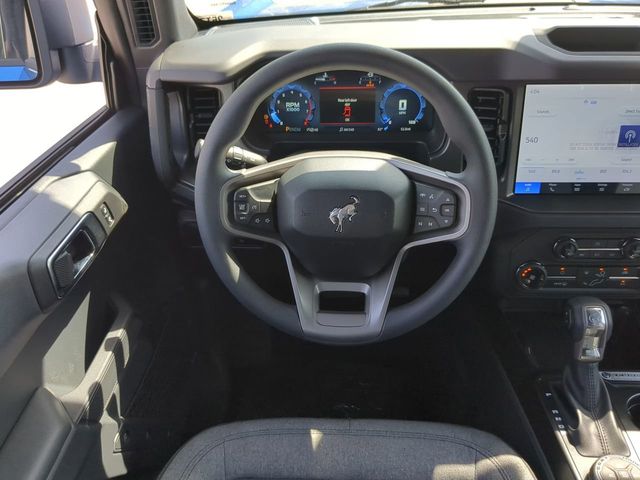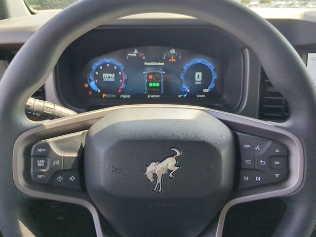 2025 Velocity Blue Metallic 2025 Ford Bronco Base 4D Sport Utility 4WD 2.3L EcoBoost I-4 Backup Camera, Bluetooth w/ Audio Streaming, Foward Collison Alert, Pre-Collision w/ Pedestrian Detection, 4D Sport Utility, 2.3L EcoBoost I-4, 10-Speed Automatic, 4WD, Equipment Group 101A. Equipment Group 101A, 4D Sport Utility, 2.3L EcoBoost I-4, 10-Speed Automatic, 4WD, 4-Wheel Disc Brakes, 4.46 Axle Ratio, 7 Speakers, ABS brakes, Air Conditioning, AM/FM radio: SiriusXM with 360L, AM/FM Stereo, Auto High-beam Headlights, Brake assist, Cloth Bucket Seats, Compass, Delay-off headlights, Driver door bin, Driver vanity mirror, Dual front impact airbags, Dual front side impact airbags, Electronic Stability Control, Emergency communication system: 911 Assist, Exterior Parking Camera Rear, Front anti-roll bar, Front Bucket Seats, Front Center Armrest, Front reading lights, Front wheel independent suspension, Fully automatic headlights, Heated door mirrors, Illuminated entry, Integrated roll-over protection, Low tire pressure warning, Occupant sensing airbag, Outside temperature display, Overhead airbag, Overhead console, Panic alarm, Passenger door bin, Passenger vanity mirror, Power door mirrors, Power steering, Power windows, Radio data system, Remote keyless entry, Security system, SiriusXM w/360L, Speed control, Split folding rear seat, Steering wheel mounted audio controls, SYNC 4, Tachometer, Telescoping steering wheel, Tilt steering wheel, Traction control, Trip computer, Variably intermittent wipers, and Wheels: 16" Bright Polished Silver-Painted Steel.