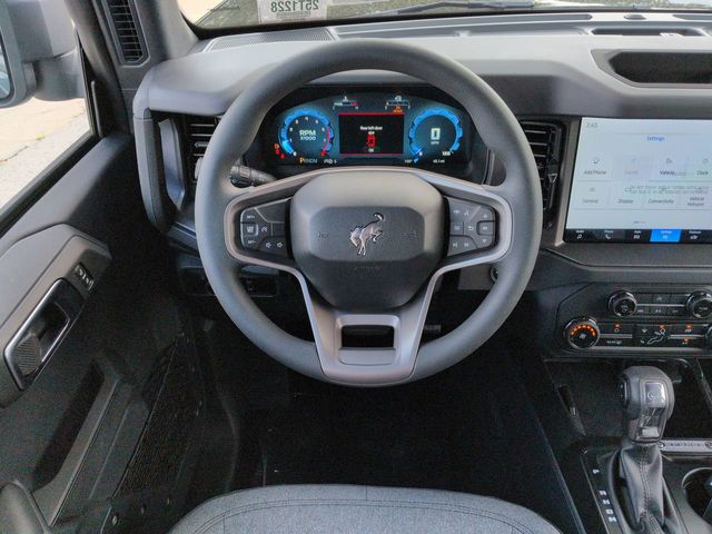 2025 Shadow Black 2025 Ford Bronco Base 4D Sport Utility 4WD 2.3L EcoBoost I-4 4D Sport Utility, 2.3L EcoBoost I-4, 10-Speed Automatic, 4WD, 12" LCD Productivity Touchscreen, Auto Emergency Braking, Auto LED Headlights, Backup Camera, Equipment Group 101A, Hill Start Assist, Pre Collision Assist w/ AEB, Push Button Start. Equipment Group 101A, 4D Sport Utility, 2.3L EcoBoost I-4, 10-Speed Automatic, 4WD, 12" LCD Productivity Touchscreen, Auto Emergency Braking, Auto LED Headlights, Backup Camera, Hill Start Assist, Pre Collision Assist w/ AEB, Push Button Start, 4-Wheel Disc Brakes, 4.46 Axle Ratio, 7 Speakers, ABS brakes, Air Conditioning, AM/FM radio: SiriusXM with 360L, AM/FM Stereo, Auto High-beam Headlights, Brake assist, Cloth Bucket Seats, Compass, Delay-off headlights, Driver door bin, Driver vanity mirror, Dual front impact airbags, Dual front side impact airbags, Electronic Stability Control, Emergency communication system: 911 Assist, Exterior Parking Camera Rear, Front anti-roll bar, Front Bucket Seats, Front Center Armrest, Front reading lights, Front wheel independent suspension, Fully automatic headlights, Heated door mirrors, Illuminated entry, Integrated roll-over protection, Low tire pressure warning, Occupant sensing airbag, Outside temperature display, Overhead airbag, Overhead console, Panic alarm, Passenger door bin, Passenger vanity mirror, Power door mirrors, Power steering, Power windows, Radio data system, Remote keyless entry, Security system, SiriusXM w/360L, Speed control, Split folding rear seat, Steering wheel mounted audio controls, SYNC 4, Tachometer, Telescoping steering wheel, Tilt steering wheel, Traction control, Trip computer, Variably intermittent wipers, and Wheels: 16" Bright Polished Silver-Painted Steel. $1,000 - Exp. 12/31/2026 Retail Trade Assistance. Must trade in a vehicle to qualify $1,000 - Exp. 12/31/2026 Dealer Finance Assistance. Must finance through dealer lender to qualify.