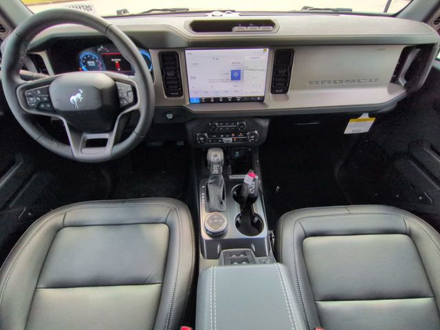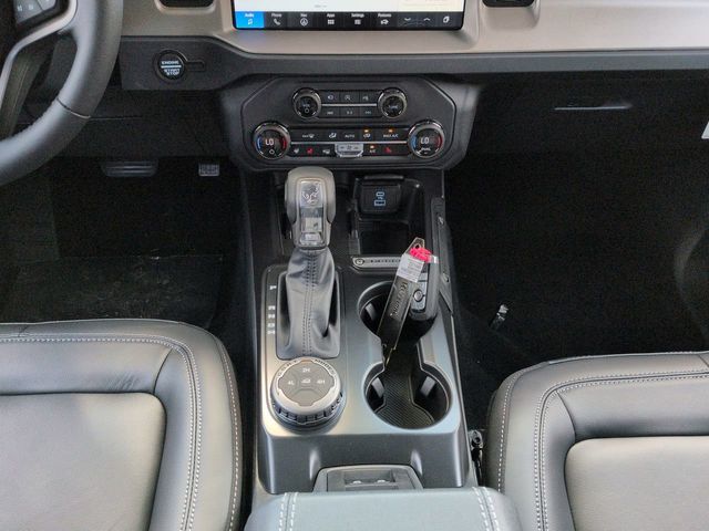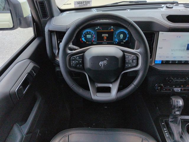 2025 Desert Sand 2025 Ford Bronco Outer Banks Outer Banks 4D Sport Utility 4WD 2.7L EcoBoost V6 4D Sport Utility, 2.7L EcoBoost V6, 10-Speed Automatic, 4WD, 12" LCD Productivity Touchscreen, 360-Degree Camera, 360-Degree Camera, Adaptive Cruise Control, Adaptive Cruise Control, Auto LED Headlights, Backup Camera, Equipment Group 314A Lux Package, Evasive Steering Assist, Front Parking Sensors, Hard Top Sound Deadening Headliner, Hill Start Assist, Information on Demand Panel, Leather Seats, Navigation system: Connected Navigation, Painted Hard Top, Push Button Start, Radio: B&O Sound System by Bang & Olufsen, Rear-Window Defroster & Washer, Sideview Mirrors, Trailer Tow Package (DIO), Universal Garage Door Opener. Equipment Group 314A Lux Package (360-Degree Camera, Adaptive Cruise Control, Evasive Steering Assist, Front Parking Sensors, Information on Demand Panel, Radio: B&O Sound System by Bang & Olufsen, Sideview Mirrors, and Universal Garage Door Opener), Trailer Tow Package (DIO), 4D Sport Utility, 2.7L EcoBoost V6, 10-Speed Automatic, 4WD, 12" LCD Productivity Touchscreen, 360-Degree Camera, Adaptive Cruise Control, Auto LED Headlights, Backup Camera, Hard Top Sound Deadening Headliner, Hill Start Assist, Leather Seats, Navigation system: Connected Navigation, Painted Hard Top, Push Button Start, Rear-Window Defroster & Washer, 18" Bright Machined Aluminum Wheels, 3.73 Axle Ratio, 4-Wheel Disc Brakes, 7 Speakers, ABS brakes, Air Conditioning, Alloy wheels, AM/FM radio: SiriusXM with 360L, AM/FM Stereo, Auto High-beam Headlights, Auto-dimming Rear-View mirror, Automatic temperature control, Brake assist, Compass, Connected Navigation, Delay-off headlights, Driver door bin, Driver vanity mirror, Dual front impact airbags, Dual front side impact airbags, Electronic Stability Control, Emergency communication system: 911 Assist, Exterior Parking Camera Rear, Front anti-roll bar, Front Bucket Seats, Front Center Armrest, Front dual zone A/C, Front fog lights, Front reading lights, Front wheel independent suspension, Fully automatic headlights, Heated door mirrors, Heated front seats, Heated Leather-Trimmed/Vinyl Bucket Seats, Heated steering wheel, Illuminated entry, Integrated roll-over protection, Leather Shift Knob, Low tire pressure warning, Occupant sensing airbag, Outside temperature display, Overhead airbag, Overhead console, Panic alarm, Passenger door bin, Passenger vanity mirror, Power door mirrors, Power driver seat, Power passenger seat, Power steering, Power windows, Radio data system, Rear seat center armrest, Remote keyless entry, Security system, SiriusXM w/360L, Speed control, Split folding rear seat, Steering wheel mounted audio controls, SYNC 4, Tachometer, Telescoping steering wheel, Tilt steering wheel, Traction control, Trip computer, Variably intermittent wipers, and Voltmeter.