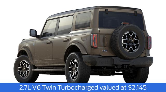 2025 Marsh Gray 2025 Ford Bronco Outer Banks Outer Banks 4D Sport Utility 4WD 2.7L EcoBoost V6 4D Sport Utility, 2.7L EcoBoost V6, 10-Speed Automatic, 4WD, 12" LCD Productivity Touchscreen, 360-Degree Camera, 360-Degree Camera, Adaptive Cruise Control, Adaptive Cruise Control, Auto LED Headlights, Backup Camera, Equipment Group 314A Lux Package, Evasive Steering Assist, Front Parking Sensors, Hard Top Sound Deadening Headliner, Hill Start Assist, Information on Demand Panel, Navigation system: Connected Navigation, Painted Hard Top, Radio: B&O Sound System by Bang & Olufsen, Rear-Window Defroster & Washer, Sideview Mirrors, Trailer Tow Package (DIO), Universal Garage Door Opener. Equipment Group 314A Lux Package (360-Degree Camera, Adaptive Cruise Control, Evasive Steering Assist, Front Parking Sensors, Information on Demand Panel, Radio: B&O Sound System by Bang & Olufsen, Sideview Mirrors, and Universal Garage Door Opener), Trailer Tow Package (DIO), 4D Sport Utility, 2.7L EcoBoost V6, 10-Speed Automatic, 4WD, 12" LCD Productivity Touchscreen, 360-Degree Camera, Adaptive Cruise Control, Auto LED Headlights, Backup Camera, Hard Top Sound Deadening Headliner, Hill Start Assist, Navigation system: Connected Navigation, Painted Hard Top, Rear-Window Defroster & Washer, 18" Bright Machined Aluminum Wheels, 3.73 Axle Ratio, 4-Wheel Disc Brakes, 7 Speakers, ABS brakes, Air Conditioning, Alloy wheels, AM/FM radio: SiriusXM with 360L, AM/FM Stereo, Auto High-beam Headlights, Auto-dimming Rear-View mirror, Automatic temperature control, Brake assist, Compass, Connected Navigation, Delay-off headlights, Driver door bin, Driver vanity mirror, Dual front impact airbags, Dual front side impact airbags, Electronic Stability Control, Emergency communication system: 911 Assist, Exterior Parking Camera Rear, Front anti-roll bar, Front Bucket Seats, Front Center Armrest, Front dual zone A/C, Front fog lights, Front reading lights, Front wheel independent suspension, Fully automatic headlights, Heated door mirrors, Heated front seats, Heated Leather-Trimmed/Vinyl Bucket Seats, Heated steering wheel, Illuminated entry, Integrated roll-over protection, Leather Shift Knob, Low tire pressure warning, Occupant sensing airbag, Outside temperature display, Overhead airbag, Overhead console, Panic alarm, Passenger door bin, Passenger vanity mirror, Power door mirrors, Power driver seat, Power passenger seat, Power steering, Power windows, Radio data system, Rear seat center armrest, Remote keyless entry, Security system, SiriusXM w/360L, Speed control, Split folding rear seat, Steering wheel mounted audio controls, SYNC 4, Tachometer, Telescoping steering wheel, Tilt steering wheel, Traction control, Trip computer, Variably intermittent wipers, and Voltmeter.