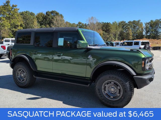 2025 Green Metallic 2025 Ford Bronco Outer Banks Outer Banks 4D Sport Utility 4WD 2.3L EcoBoost I-4 4D Sport Utility, 2.3L EcoBoost I-4, 10-Speed Automatic, 4WD, 12" LCD Productivity Touchscreen, 4.7 Final Drive Ratio, Auto LED Headlights, Backup Camera, Equipment Group 312A Mid Package, High Clearance Fender Flares, High Clearance Suspension, Hill Start Assist, Navigation system: Connected Navigation, Position-Sensitive Bilstein Shock Absorbers, Push Button Start, Sasquatch Package, Trailer Tow Package (DIO), Wheels: 17" Carbonized Gray Painted Aluminum. Equipment Group 312A Mid Package, Sasquatch Package (4.7 Final Drive Ratio, High Clearance Fender Flares, High Clearance Suspension, Position-Sensitive Bilstein Shock Absorbers, and Wheels: 17" Carbonized Gray Painted Aluminum), Trailer Tow Package (DIO), 4D Sport Utility, 2.3L EcoBoost I-4, 10-Speed Automatic, 4WD, 12" LCD Productivity Touchscreen, Auto LED Headlights, Backup Camera, Hill Start Assist, Navigation system: Connected Navigation, Push Button Start, 18" Bright Machined Aluminum Wheels, 4-Wheel Disc Brakes, 7 Speakers, ABS brakes, Air Conditioning, Alloy wheels, AM/FM radio: SiriusXM with 360L, AM/FM Stereo, Auto High-beam Headlights, Auto-dimming Rear-View mirror, Automatic temperature control, Brake assist, Carbonized Gray Molded-In-Color Hard Top, Compass, Connected Navigation, Delay-off headlights, Driver door bin, Driver vanity mirror, Dual front impact airbags, Dual front side impact airbags, Electronic Stability Control, Emergency communication system: 911 Assist, Exterior Parking Camera Rear, Front anti-roll bar, Front Bucket Seats, Front Center Armrest, Front dual zone A/C, Front fog lights, Front reading lights, Front wheel independent suspension, Fully automatic headlights, Hard Top Sound Deadening Headliner, Heated door mirrors, Heated front seats, Heated Leather-Trimmed/Vinyl Bucket Seats, Heated steering wheel, Illuminated entry, Integrated roll-over protection, Leather Shift Knob, Low tire pressure warning, Occupant sensing airbag, Outside temperature display, Overhead airbag, Overhead console, Panic alarm, Passenger door bin, Passenger vanity mirror, Power door mirrors, Power driver seat, Power passenger seat, Power steering, Power windows, Radio data system, Rear seat center armrest, Rear-Window Defroster & Washer, Remote keyless entry, Security system, SiriusXM w/360L, Speed control, Split folding rear seat, Steering wheel mounted audio controls, SYNC 4, Tachometer, Telescoping steering wheel, Tilt steering wheel, Traction control, Trip computer, Variably intermittent wipers, and Voltmeter.