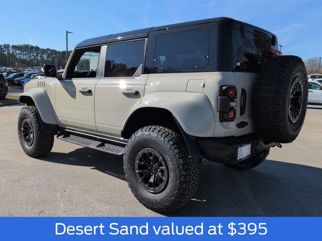 2025 Desert Sand 2025 Ford Bronco Raptor Raptor 4D Sport Utility 4WD 3.0L EcoBoost V6 Equipment Group 374A Lux Package, 12 Speakers, 4-Wheel Disc Brakes, ABS brakes, Air Conditioning, Alloy wheels, AM/FM radio: SiriusXM with 360L, Auto High-beam Headlights, Auto-dimming Rear-View mirror, Automatic temperature control, Brake assist, Compass, Connected Navigation, Convertible HardTop, Convertible roof lining, Delay-off headlights, Driver door bin, Driver vanity mirror, Dual front impact airbags, Dual front side impact airbags, Electronic Stability Control, Emergency communication system: 911 Assist, Exterior Parking Camera Rear, Front anti-roll bar, Front Bucket Seats, Front Center Armrest, Front dual zone A/C, Front fog lights, Front License Plate Bracket, Front reading lights, Front wheel independent suspension, Fully automatic headlights, Garage door transmitter, Glass rear window, Hard Top Sound Deadening Headliner, Heated door mirrors, Heated front seats, Heated steering wheel, Illuminated entry, Integrated roll-over protection, Interior Carbon Fiber Pack, Internet access capable: FordPass Connect, Leather Shift Knob, Leather-Trimmed/Vinyl Bucket Seats, Low tire pressure warning, Marine Grade Vinyl Bucket Seats, Navigation system: Connected Navigation, Occupant sensing airbag, Outside temperature display, Overhead airbag, Overhead console, Panic alarm, Passenger door bin, Passenger vanity mirror, Power door mirrors, Power steering, Power windows, Radio data system, Radio: B&O Sound System by Bang & Olufsen, Rear anti-roll bar, Rear seat center armrest, Rear window defroster, Rear window wiper, Rear-Window Defroster & Washer, Remote keyless entry, Security system, Shadow Black Painted Hard Top, SiriusXM w/360L, Speed control, Split folding rear seat, Steering wheel mounted audio controls, SYNC 4, Tachometer, Telescoping steering wheel, Tilt steering wheel, Traction control, Trip computer, Turn signal indicator mirrors, Variably intermittent wipers, Voltmeter, Wheels: 17" Black High Gloss-Painted Aluminum, and Wheels: 17" Dark Carbonized Gray Alloy Painted. $1,000 - Exp. 12/31/2026 Retail Trade Assistance. Must trade in a vehicle to qualify $1,000 - Exp. 12/31/2026 Dealer Finance Assistance. Must finance through dealer lender to qualify.