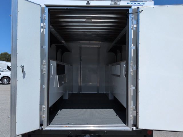 tuff-ply rubber flooring, adjustable shelving in compartments, led cargo lights, sliding door between cab and cargo area, 12" steel step rear bumper, translucent roof, work counter, 3 bow roof ladder rack