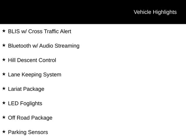 2025 Agate Black Metallic 2025 Ford F-150 Lariat Lariat 4D SuperCrew 4WD 3.5L V6 EcoBoost 4D SuperCrew, 3.5L V6 EcoBoost, 10-Speed Automatic, 4WD, 12" LCD Productivity Touchscreen, 2nd Row Heated Seats, 360-Degree Camera, 4x4 FX4 Off-Road Bodyside Decal, 5G WiFi Hotspot Telematics, Adaptive Cruise Control, Ambient Lighting - Ice Blue Color Only, Auto Emergency Braking, Auto LED Headlights, Backup Camera, Blind Spot Monitoring, BLIS w/ Cross Traffic Alert, Bluetooth w/ Audio Streaming, Console Worksurface, Electronic Locking w/3.31 Axle Ratio, Equipment Group 502A High, FX4 Off-Road Package, Heads-Up Display, Hill Descent Control, Hill Descent Control, Illuminated Driver & Passenger Visors, Integrated Trailer Brake Controller, Lane Keeping System, Lariat Package, LED Foglights, Mobile Office Package, Monotube Rear Shocks, Off Road Package, Off-Road Tuned Front Shock Absorbers, Parking Sensors, Partitioned Lockable Rear Storage, Post Collision Braking, Power Mirror Package, Power Package, Power-Sliding Rear Window, Pre Collision Assist w/ AEB, Premium Sound Package, Radio: B&O Unleashed Sound System by Bang & Olufsen, Rock Crawl Mode, Skid Plate Package, Spray-In Bedliner, Tow Package, Tow/Haul Package, Trailer Package, Tray Style Floor Liner w/o Carpet Mats, Wheels: 20" Chrome-Like PVD, Wireless Charging. Equipment Group 502A High (2nd Row Heated Seats, Ambient Lighting - Ice Blue Color Only, Heads-Up Display, Illuminated Driver & Passenger Visors, Power-Sliding Rear Window, Radio: B&O Unleashed Sound System by Bang & Olufsen, and Wheels: 20" Chrome-Like PVD), FX4 Off-Road Package (4x4 FX4 Off-Road Bodyside Decal, Electronic Locking w/3.31 Axle Ratio, Hill Descent Control, Monotube Rear Shocks, Off-Road Tuned Front Shock Absorbers, Rock Crawl Mode, and Tray Style Floor Liner w/o Carpet Mats), Mobile Office Package (Console Worksurface, Partitioned Lockable Rear Storage, and Wireless Charging), Tow/Haul Package (Integrated Trailer Brake Controller), 4D SuperCrew, 3.5L V6 EcoBoost, 10-Speed Automatic, 4WD, 12" LCD Productivity Touchscreen, 360-Degree Camera, 5G WiFi Hotspot Telematics, Adaptive Cruise Control, Auto Emergency Braking, Auto LED Headlights, Backup Camera, Blind Spot Monitoring, BLIS w/ Cross Traffic Alert, Bluetooth w/ Audio Streaming, Hill Descent Control, Lane Keeping System, Lariat Package, LED Foglights, Off Road Package, Parking Sensors, Post Collision Braking, Power Mirror Package, Power Package, Pre Collision Assist w/ AEB, Premium Sound Package, Skid Plate Package, Spray-In Bedliner, Tow Package, Trailer Package, 4-Wheel Disc Brakes, 8 Speakers, ABS brakes, ActiveX Trimmed Bucket Seats, ActiveX Trimmed Smoked Truffle Bucket Seats, Adjustable pedals, Air Conditioning, Alloy wheels, AM/FM radio: SiriusXM with 360L, Auto High-beam Headlights, Auto-dimming door mirrors, Auto-dimming Rear-View mirror, Automatic temperature control, BlueCruise Equipped (1-Year Plan), Brake assist, Bumpers: chrome, Chrome wheels, Compass, Delay-off headlights, Driver door bin, Driver vanity mirror, Dual front impact airbags, Dual front side impact airbags, Electronic Stability Control, Emergency communication system: SYNC 4 911 Assist, Front anti-roll bar, Front Bucket Seats, Front Center Armrest, Front dual zone A/C, Front fog lights, Front License Plate Bracket, Front reading lights, Front wheel independent suspension, Fully automatic headlights, Garage door transmitter, Heated door mirrors, Heated front seats, Heated steering wheel, Illuminated entry, Low tire pressure warning, Memory seat, Navigation system: Connected Navigation, Occupant sensing airbag, Outside temperature display, Overh Price includes: $1,000 - Exp. 12/31/2026 Retail Trade Assistance. Must trade in a vehicle to qualify $1,000 - Exp. 12/31/2026 Dealer Finance Assistance. Must finance through dealer