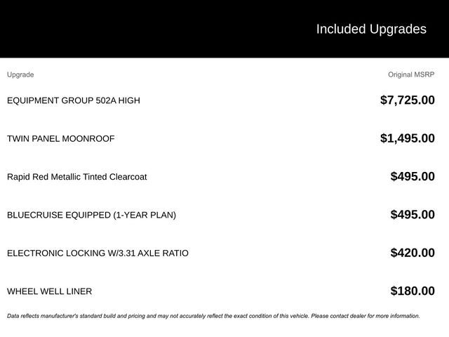2025 Rapid Red Metallic Tinted Clearcoat 2025 Ford F-150 Lariat Lariat 4D SuperCrew 4WD 5.0L V8 4D SuperCrew, 5.0L V8, 10-Speed Automatic, 4WD, 12" LCD Productivity Touchscreen, 2nd Row Heated Seats, 360-Degree Camera, 5G WiFi Hotspot Telematics, Adaptive Cruise Control, Ambient Lighting - Ice Blue Color Only, Auto LED Headlights, Backup Camera, Blind Spot Monitoring, BLIS w/ Cross Traffic Alert, Bluetooth w/ Audio Streaming, Console Worksurface, Electronic Locking w/3.31 Axle Ratio, Equipment Group 502A High, Heads-Up Display, Illuminated Driver & Passenger Visors, Lariat Package, LED Foglights, LED Projector Headlights, Memory Package, Mobile Office Package, Navigation system: Connected Navigation, Panoramic Sunroof/Moonroof, Partitioned Lockable Rear Storage, Post Collision Braking, Power Mirror Package, Power Package, Power-Sliding Rear Window, Pre Collision Assist w/ AEB, Premium Audio Package, Premium Sound Package, Push Button Start, Radio: B&O Unleashed Sound System by Bang & Olufsen, Rain sensing wipers, Remote Start, Reverse Brake Assist, Reverse Sensing, Tow Package, Trailer Package, Wheels: 20" Chrome-Like PVD, Wireless Charging, Wireless Charging Pad. Equipment Group 502A High (2nd Row Heated Seats, Ambient Lighting - Ice Blue Color Only, Heads-Up Display, Illuminated Driver & Passenger Visors, Power-Sliding Rear Window, Radio: B&O Unleashed Sound System by Bang & Olufsen, and Wheels: 20" Chrome-Like PVD), Mobile Office Package (Console Worksurface, Partitioned Lockable Rear Storage, and Wireless Charging), 4D SuperCrew, 5.0L V8, 10-Speed Automatic, 4WD, 12" LCD Productivity Touchscreen, 360-Degree Camera, 5G WiFi Hotspot Telematics, Adaptive Cruise Control, Auto LED Headlights, Backup Camera, Blind Spot Monitoring, BLIS w/ Cross Traffic Alert, Bluetooth w/ Audio Streaming, Electronic Locking w/3.31 Axle Ratio, Lariat Package, LED Foglights, LED Projector Headlights, Memory Package, Navigation system: Connected Navigation, Panoramic Sunroof/Moonroof, Post Collision Braking, Power Mirror Package, Power Package, Pre Collision Assist w/ AEB, Premium Audio Package, Premium Sound Package, Push Button Start, Rain sensing wipers, Remote Start, Reverse Brake Assist, Reverse Sensing, Tow Package, Trailer Package, Wireless Charging Pad, 4-Wheel Disc Brakes, 8 Speakers, ABS brakes, ActiveX Trimmed Bucket Seats, Adjustable pedals, Air Conditioning, Alloy wheels, AM/FM radio: SiriusXM with 360L, Auto High-beam Headlights, Auto-dimming door mirrors, Auto-dimming Rear-View mirror, Automatic temperature control, Brake assist, Bumpers: chrome, Chrome wheels, Compass, Delay-off headlights, Driver door bin, Driver vanity mirror, Dual front impact airbags, Dual front side impact airbags, Electronic Stability Control, Emergency communication system: SYNC 4 911 Assist, Front anti-roll bar, Front Bucket Seats, Front Center Armrest, Front dual zone A/C, Front fog lights, Front reading lights, Front wheel independent suspension, Fully automatic headlights, Garage door transmitter, Heated door mirrors, Heated front seats, Heated steering wheel, Illuminated entry, Low tire pressure warning, Memory seat, Occupant sensing airbag, Outside temperature display, Overhead airbag, Overhead console, Panic alarm, Passenger door bin, Passenger vanity mirror, Pedal memory, Power door mirrors, Power driver seat, Power passenger seat, Power steering, Power windows, Radio data system, Rear reading lights, Rear seat center armrest, Rear step bumper, Rear window defroster, Remote keyless entry, Security system, Speed control, Split folding rear seat, Steering wheel mounted audio controls, Tachometer, Telescoping steering wheel, Tilt steering wheel, Traction control, Trip computer, Turn signal indicator mirrors, Variably intermittent wipers, Ventilated front seats, an