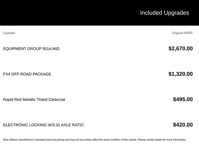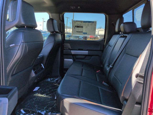2025 Rapid Red Metallic Tinted Clearcoat 2025 Ford F-150 Lariat Lariat 4D SuperCrew 4WD 5.0L V8 4WD. Equipment Group 501A Mid (6" Angular Bright Anodized Step Bar, Illuminated Driver & Passenger Visors, Power-Sliding Rear Window, and Wheels: 20" Chrome-Like PVD), FX4 Off-Road Package (4x4 FX4 Off-Road Bodyside Decal, Hill Descent Control, Monotube Rear Shocks, Off-Road Tuned Front Shock Absorbers, Rock Crawl Mode, and Tray Style Floor Liner w/o Carpet Mats), 4WD, 4-Wheel Disc Brakes, 8 Speakers, ABS brakes, ActiveX Trimmed Bucket Seats, Adjustable pedals, Air Conditioning, Alloy wheels, AM/FM radio: SiriusXM with 360L, Auto High-beam Headlights, Auto-dimming door mirrors, Auto-dimming Rear-View mirror, Automatic temperature control, Brake assist, Bumpers: chrome, Chrome wheels, Compass, Delay-off headlights, Driver door bin, Driver vanity mirror, Dual front impact airbags, Dual front side impact airbags, Electronic Stability Control, Emergency communication system: SYNC 4 911 Assist, Front anti-roll bar, Front Bucket Seats, Front Center Armrest, Front dual zone A/C, Front fog lights, Front License Plate Bracket, Front reading lights, Front wheel independent suspension, Fully automatic headlights, Garage door transmitter, Heated door mirrors, Heated front seats, Heated steering wheel, Illuminated entry, Internet access capable: FordPass Connect 5G, Low tire pressure warning, Memory seat, Navigation system: Connected Navigation, Occupant sensing airbag, Outside temperature display, Overhead airbag, Overhead console, Panic alarm, Passenger door bin, Passenger vanity mirror, Pedal memory, Power door mirrors, Power driver seat, Power passenger seat, Power steering, Power windows, Radio data system, Radio: B&O Sound System by Bang & Olufsen, Rain sensing wipers, Rear reading lights, Rear seat center armrest, Rear step bumper, Rear window defroster, Remote keyless entry, Security system, Speed control, Split folding rear seat, Steering wheel mounted audio controls, SYNC 4 w/Enhanced Voice Recognition, Tachometer, Telescoping steering wheel, Tilt steering wheel, Traction control, Trip computer, Turn signal indicator mirrors, Variably intermittent wipers, Ventilated front seats, Voltmeter, and Wheels: 18" Chrome-Like PVD. $1,000 - Exp. 12/31/2026 Retail Trade Assistance. Must trade in a vehicle to qualify $1,000 - Exp. 12/31/2026 Dealer Finance Assistance. Must finance through dealer lender to qualify.