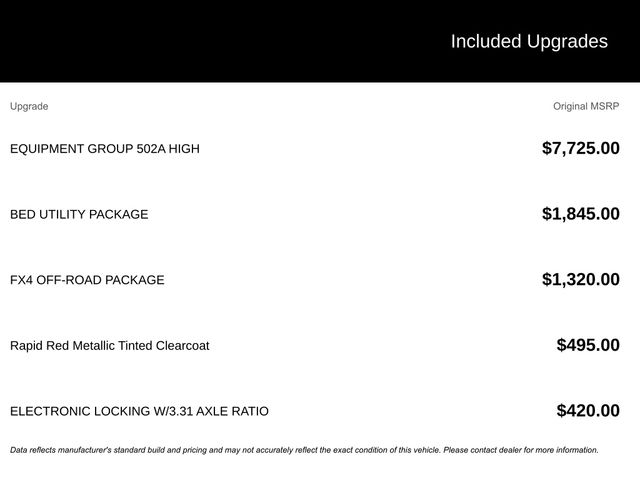 2025 Rapid Red Metallic Tinted Clearcoat 2025 Ford F-150 Lariat Lariat 4D SuperCrew 4WD 3.5L V6 EcoBoost 4WD, Spray-In Bedliner. Bed Utility Package (4 Pickup Box Tie-Down Plates, LED Box Lighting, Power Tailgate, and Pro Access Tailgate), Equipment Group 502A High (2nd Row Heated Seats, Ambient Lighting - Ice Blue Color Only, Heads-Up Display, Illuminated Driver & Passenger Visors, Power-Sliding Rear Window, Radio: B&O Unleashed Sound System by Bang & Olufsen, and Wheels: 20" Chrome-Like PVD), FX4 Off-Road Package (4x4 FX4 Off-Road Bodyside Decal, Hill Descent Control, Monotube Rear Shocks, Off-Road Tuned Front Shock Absorbers, Rock Crawl Mode, and Tray Style Floor Liner w/o Carpet Mats), Mobile Office Package (Console Worksurface, Partitioned Lockable Rear Storage, and Wireless Charging), 4WD, Spray-In Bedliner, 4-Wheel Disc Brakes, 6" Extended Running Boards, 8 Speakers, ABS brakes, ActiveX Trimmed Bucket Seats, Adjustable pedals, Air Conditioning, Alloy wheels, AM/FM radio: SiriusXM with 360L, Auto High-beam Headlights, Auto-dimming door mirrors, Auto-dimming Rear-View mirror, Automatic temperature control, Brake assist, Bumpers: chrome, Chrome wheels, Compass, Delay-off headlights, Driver door bin, Driver vanity mirror, Dual front impact airbags, Dual front side impact airbags, Electronic Stability Control, Emergency communication system: SYNC 4 911 Assist, Front anti-roll bar, Front Bucket Seats, Front Center Armrest, Front dual zone A/C, Front fog lights, Front reading lights, Front wheel independent suspension, Fully automatic headlights, Garage door transmitter, Heated door mirrors, Heated front seats, Heated steering wheel, Illuminated entry, Internet access capable: FordPass Connect 5G, Low tire pressure warning, Memory seat, Navigation system: Connected Navigation, Occupant sensing airbag, Outside temperature display, Overhead airbag, Overhead console, Panic alarm, Passenger door bin, Passenger vanity mirror, Pedal memory, Power door mirrors, Power driver seat, Power passenger seat, Power steering, Power windows, Radio data system, Radio: B&O Sound System by Bang & Olufsen, Rain sensing wipers, Rear reading lights, Rear seat center armrest, Rear step bumper, Rear window defroster, Remote keyless entry, Security system, Speed control, Split folding rear seat, Steering wheel mounted audio controls, SYNC 4 w/Enhanced Voice Recognition, Tachometer, Telescoping steering wheel, Tilt steering wheel, Traction control, Trip computer, Turn signal indicator mirrors, Variably intermittent wipers, Ventilated front seats, Voltmeter, and Wheels: 18" Chrome-Like PVD. $1,000 - Exp. 12/31/2026 Retail Trade Assistance. Must trade in a vehicle to qualify $1,000 - Exp. 12/31/2026 Dealer Finance Assistance. Must finance through dealer lender to qualify.