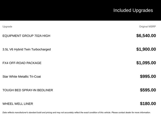 2025 Star White Metallic Tri-Coat 2025 Ford F-150 Platinum Platinum 4D SuperCrew 4WD 3.5L PowerBoost Full-Hybrid V6 12" LCD Productivity Touchscreen, 5G WiFi Hotspot Telematics, Adaptive Cruise Control, Auto LED Headlights, Backup Camera, Blind Spot Monitoring, BLIS w/ Cross Traffic Alert, BlueCruise, Leather Seats, Off Road Package, Parking Sensors, Post Collision Braking, Power Running Boards, Power Sliding Rear Window, Pre Collision Assist w/ AEB, Reverse Brake Assist, Reverse Sensing, Skid Plate Package, Tow Package, Trailer Package, 4D SuperCrew, 3.5L PowerBoost Full-Hybrid V6, 10-Speed Automatic, 4WD, 4x4 FX4 Off-Road Bodyside Decal, Electronic Locking w/3.55 Axle Ratio, Equipment Group 702A High, FX4 Off-Road Package, Heads-Up Display, Hill Descent Control, Monotube Rear Shocks, Off-Road Tuned Front Shock Absorbers, Radio: B&O Unleashed Sound System by Bang & Olufsen, Rock Crawl Mode, Twin Panel Moonroof. Equipment Group 702A High (Heads-Up Display, Radio: B&O Unleashed Sound System by Bang & Olufsen, and Twin Panel Moonroof), FX4 Off-Road Package (4x4 FX4 Off-Road Bodyside Decal, Hill Descent Control, Monotube Rear Shocks, Off-Road Tuned Front Shock Absorbers, and Rock Crawl Mode), 4D SuperCrew, 3.5L PowerBoost Full-Hybrid V6, 10-Speed Automatic, 4WD, Electronic Locking w/3.55 Axle Ratio, 4-Wheel Disc Brakes, 8 Speakers, ABS brakes, Adjustable pedals, Air Conditioning, Alloy wheels, Auto High-beam Headlights, Auto tilt-away steering wheel, Auto-dimming door mirrors, Auto-dimming Rear-View mirror, Automatic temperature control, Brake assist, Bumpers: body-color, Compass, Delay-off headlights, Driver door bin, Driver vanity mirror, Dual front impact airbags, Dual front side impact airbags, Electronic Stability Control, Emergency communication system: SYNC 4 911 Assist, Front anti-roll bar, Front Bucket Seats, Front Center Armrest, Front dual zone A/C, Front fog lights, Front reading lights, Front wheel independent suspension, Fully automatic headlights, Garage door transmitter, Heated door mirrors, Heated front seats, Heated rear seats, Heated steering wheel, Illuminated entry, Leather steering wheel, Low tire pressure warning, Memory seat, Navigation system: Connected Navigation, Occupant sensing airbag, Outside temperature display, Overhead airbag, Overhead console, Panic alarm, Passenger door bin, Passenger vanity mirror, Pedal memory, Power door mirrors, Power driver seat, Power passenger seat, Power steering, Power windows, Radio data system, Radio: B&O Sound System by Bang & Olufsen, Rain sensing wipers, Rear reading lights, Rear seat center armrest, Rear step bumper, Rear window defroster, Remote keyless entry, Security system, Speed control, Split folding rear seat, Steering wheel memory, Steering wheel mounted audio controls, SYNC 4 w/Enhanced Voice Recognition, Tachometer, Telescoping steering wheel, Tilt steering wheel, Tough Bed Spray-In Bedliner, Traction control, Trip computer, Turn signal indicator mirrors, Unique Multi-Contour Leather Bucket Seats, Variably intermittent wipers, Ventilated front seats, Voltmeter, Wheel Well Liner, and Wheels: 20" Painted Gloss Ebony Black.