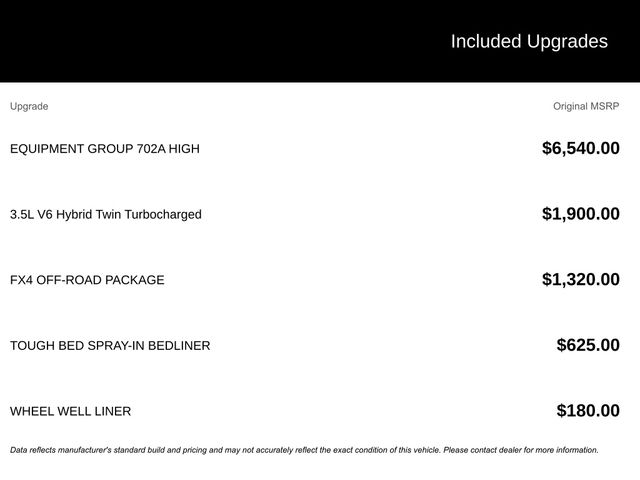 2025 Carbonized Gray Metallic 2025 Ford F-150 Platinum Platinum 4D SuperCrew 4WD 3.5L PowerBoost Full-Hybrid V6 12" LCD Productivity Touchscreen, 360-Degree Camera, 5G WiFi Hotspot Telematics, Adaptive Cruise Control, Auto LED Headlights, Backup Camera, Cold Weather Package, Lane Keeping System, Memory Package, Off Road Package, Panoramic Sunroof/Moonroof, Post Collision Braking, Power Running Boards, Power Sliding Rear Window, Premium Audio Package, Premium Sound Package, Push Button Start, Remote Start, Reverse Brake Assist, Reverse Sensing, Skid Plate Package, Tow Package, Trailer Package, 4D SuperCrew, 3.5L PowerBoost Full-Hybrid V6, 10-Speed Automatic, 4WD, 4-Wheel Disc Brakes, 4x4 FX4 Off-Road Bodyside Decal, 8 Speakers, ABS brakes, Auto High-beam Headlights, Auto-dimming door mirrors, Automatic temperature control, Brake assist, Delay-off headlights, Electronic Locking w/3.73 Axle Ratio, Electronic Stability Control, Emergency communication system: SYNC 4 911 Assist, Equipment Group 702A High, Front dual zone A/C, Front fog lights, Front wheel independent suspension, Fully automatic headlights, FX4 Off-Road Package, Heads-Up Display, Heated door mirrors, Hill Descent Control, Low tire pressure warning, Memory seat, Monotube Rear Shocks, Navigation system: Connected Navigation, Off-Road Tuned Front Shock Absorbers, Panic alarm, Pedal memory, Radio data system, Radio: B&O Sound System by Bang & Olufsen, Radio: B&O Unleashed Sound System by Bang & Olufsen, Remote keyless entry, Rock Crawl Mode, Security system, Speed control, Steering wheel memory, Steering wheel mounted audio controls, SYNC 4 w/Enhanced Voice Recognition, Tough Bed Spray-In Bedliner, Traction control, Twin Panel Moonroof. Equipment Group 702A High (Heads-Up Display, Radio: B&O Unleashed Sound System by Bang & Olufsen, and Twin Panel Moonroof), FX4 Off-Road Package (4x4 FX4 Off-Road Bodyside Decal, Hill Descent Control, Monotube Rear Shocks, Off-Road Tuned Front Shock Absorbers, and Rock Crawl Mode), 4D SuperCrew, 3.5L PowerBoost Full-Hybrid V6, 10-Speed Automatic, 4WD, 4-Wheel Disc Brakes, 8 Speakers, ABS brakes, Auto High-beam Headlights, Auto-dimming door mirrors, Automatic temperature control, Brake assist, Delay-off headlights, Electronic Locking w/3.73 Axle Ratio, Electronic Stability Control, Emergency communication system: SYNC 4 911 Assist, Front dual zone A/C, Front fog lights, Front wheel independent suspension, Fully automatic headlights, Heated door mirrors, Low tire pressure warning, Memory seat, Navigation system: Connected Navigation, Panic alarm, Pedal memory, Radio data system, Radio: B&O Sound System by Bang & Olufsen, Remote keyless entry, Security system, Speed control, Steering wheel memory, Steering wheel mounted audio controls, SYNC 4 w/Enhanced Voice Recognition, Tough Bed Spray-In Bedliner, Traction control, Adjustable pedals, Air Conditioning, Alloy wheels, Auto tilt-away steering wheel, Auto-dimming Rear-View mirror, Bumpers: body-color, Compass, Driver door bin, Driver vanity mirror, Dual front impact airbags, Dual front side impact airbags, Front anti-roll bar, Front Bucket Seats, Front Center Armrest, Front reading lights, Garage door transmitter, Heated front seats, Heated rear seats, Heated steering wheel, Illuminated entry, Leather steering wheel, Occupant sensing airbag, Outside temperature display, Overhead airbag, Overhead console, Passenger door bin, Passenger vanity mirror, Power door mirrors, Power driver seat, Power passenger seat, Power steering, Power windows, Rain sensing wipers, Rear reading lights, Rear seat center armrest, Rear step bumper, Rear window defroster, Split folding rear seat, Tachometer, Telescoping steering wheel, Tilt steering wheel, Tray Style Floor Liner, Trip computer, Turn signal indicator mirrors, Unique Multi-Contour Leather Bu