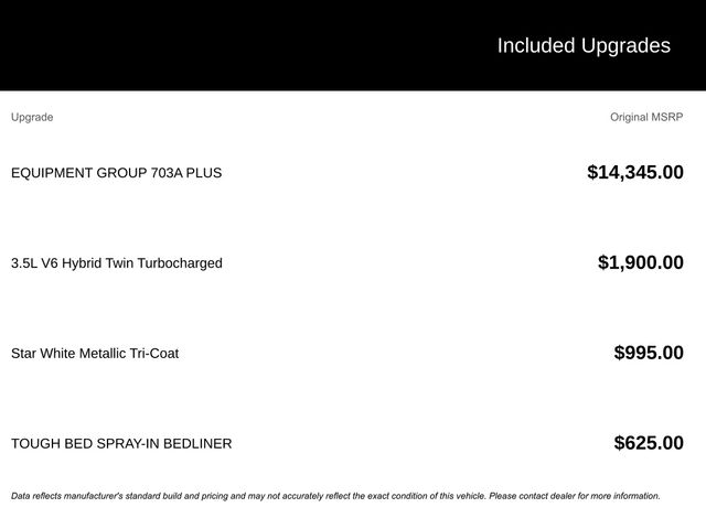2025 Star White Metallic Tri-Coat 2025 Ford F-150 Platinum Platinum 4D SuperCrew 4WD 3.5L PowerBoost Full-Hybrid V6 3.5L PowerBoost Full-Hybrid V6, 4WD. 3.5L PowerBoost Full-Hybrid V6, 4WD, 4-Wheel Disc Brakes, 8 Speakers, ABS brakes, Adjustable pedals, Air Conditioning, Alloy wheels, AM/FM radio: SiriusXM with 360L, Auto High-beam Headlights, Auto tilt-away steering wheel, Auto-dimming door mirrors, Auto-dimming Rear-View mirror, Automatic temperature control, Brake assist, Bumpers: body-color, Compass, Delay-off headlights, Driver door bin, Driver vanity mirror, Dual front impact airbags, Dual front side impact airbags, Electronic Locking w/3.55 Axle Ratio, Electronic Stability Control, Emergency communication system: SYNC 4 911 Assist, Front anti-roll bar, Front Bucket Seats, Front Center Armrest, Front dual zone A/C, Front fog lights, Front reading lights, Front wheel independent suspension, Fully automatic headlights, Garage door transmitter, Heated door mirrors, Heated front seats, Heated rear seats, Heated steering wheel, Illuminated entry, Leather steering wheel, Low tire pressure warning, Memory seat, Navigation system: Connected Navigation, Occupant sensing airbag, Outside temperature display, Overhead airbag, Overhead console, Panic alarm, Passenger door bin, Passenger vanity mirror, Pedal memory, Power door mirrors, Power driver seat, Power passenger seat, Power steering, Power windows, Radio data system, Radio: B&O Sound System by Bang & Olufsen, Rain sensing wipers, Rear reading lights, Rear seat center armrest, Rear step bumper, Rear window defroster, Remote keyless entry, Security system, Speed control, Split folding rear seat, Steering wheel memory, Steering wheel mounted audio controls, SYNC 4 w/Enhanced Voice Recognition, Tachometer, Telescoping steering wheel, Tilt steering wheel, Traction control, Trip computer, Turn signal indicator mirrors, Unique Multi-Contour Leather Bucket Seats, Variably intermittent wipers, Ventilated front seats, Voltmeter, and Wheels: 20" Painted Gloss Ebony Black.