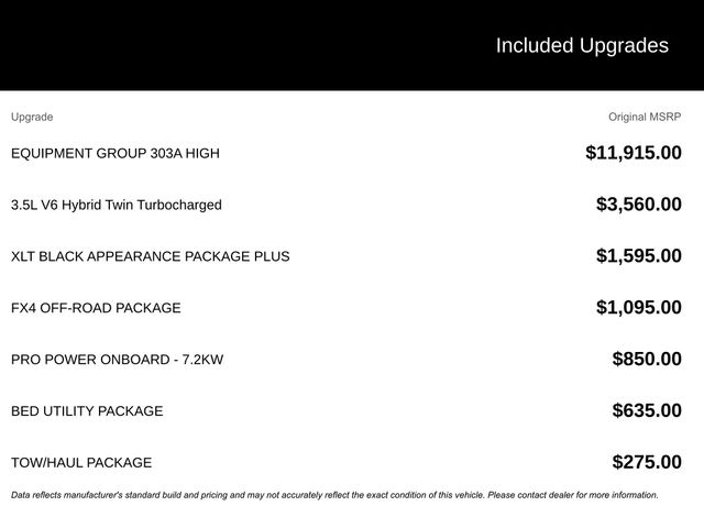 2025 Oxford White 2025 Ford F-150 XLT XLT 4D SuperCrew 4WD 3.5L PowerBoost Full-Hybrid V6 12" LCD Productivity Touchscreen, 5G WiFi Hotspot Telematics, Auto Emergency Braking, Auto LED Headlights, Backup Camera, Blind Spot Monitoring, BLIS w/ Cross Traffic Alert, Bluetooth w/ Audio Streaming, Lane Keeping System, Parking Sensors, Post Collision Braking, Power Sliding Rear Window, Pre Collision Assist w/ AEB, Premium Sound Package, Reverse Brake Assist, Reverse Sensing, Spray-In Bedliner, Tow Package, Trailer Package, Wireless Charging Pad, XLT Package, 4D SuperCrew, 3.5L PowerBoost Full-Hybrid V6, 10-Speed Automatic, 4WD, 360 Degree Camera, 400W Cab & Bed Outlets, 6" Angular Bright Anodized Step Bar, Adaptive Cruise Control w/Stop & Go, Auto-Dimming Rear-View Mirror, Bed Utility Package, Chrome Door & Tailgate Handles, Chrome Single-Tip Exhaust, Cloth 40/Console/40 Front Seats, Connected Navigation, Console Worksurface, Driver State Detection, Dual-Zone Electronic Automatic Temperature Control, Equipment Group 303A High, Evasive Steering Assist, Ford Co-Pilot360 Assist 2.0, Front Parking Sensors, FX4 Off-Road Package, Heated Front Seats, Hill Descent Control, Integrated Trailer Brake Controller, Intelligent Access w/Push Button Start, LED Box Lighting, Mobile Office Package, Monotube Rear Shocks, Off-Road Tuned Front Shock Absorbers, Power Glass Heated Sideview Mirrors, Power-Adjustable Pedals, Radio: B&O Sound System by Bang & Olufsen, Remote Start System w/Remote Tailgate Release, Rock Crawl Mode, Tailgate Step w/Tailgate Work Surface, Tow/Haul Package, Towing Technology, Wheels: 20" Chrome-Like PVD, Wrapped Steering Wheel. Bed Utility Package (LED Box Lighting and Tailgate Step w/Tailgate Work Surface), Equipment Group 303A High (360 Degree Camera, 400W Cab & Bed Outlets, 6" Angular Bright Anodized Step Bar, Adaptive Cruise Control w/Stop & Go, Auto-Dimming Rear-View Mirror, Chrome Door & Tailgate Handles, Chrome Single-Tip Exhaust, Connected Navigation, Driver State Detection, Dual-Zone Electronic Automatic Temperature Control, Evasive Steering Assist, Ford Co-Pilot360 Assist 2.0, Front Parking Sensors, Heated Front Seats, Intelligent Access w/Push Button Start, Power Glass Heated Sideview Mirrors, Power-Adjustable Pedals, Radio: B&O Sound System by Bang & Olufsen, Remote Start System w/Remote Tailgate Release, Towing Technology, Wheels: 20" Chrome-Like PVD, and Wrapped Steering Wheel), FX4 Off-Road Package (Hill Descent Control, Monotube Rear Shocks, Off-Road Tuned Front Shock Absorbers, and Rock Crawl Mode), Mobile Office Package (Console Worksurface), Tow/Haul Package (Integrated Trailer Brake Controller), 4D SuperCrew, 3.5L PowerBoost Full-Hybrid V6, 10-Speed Automatic, 4WD, Cloth 40/Console/40 Front Seats, 3.31 Axle Ratio, 4-Wheel Disc Brakes, 6 Speakers, ABS brakes, Air Conditioning, Alloy wheels, Auto High-beam Headlights, Brake assist, Bumpers: chrome, Chrome wheels, Cloth 40/20/40 Front Seat, Compass, Delay-off headlights, Driver door bin, Driver vanity mirror, Dual front impact airbags, Dual front side impact airbags, Electronic Locking w/3.73 Axle Ratio, Electronic Stability Control, Emergency communication system: SYNC 4 911 Assist, Front anti-roll bar, Front fog lights, Front License Plate Bracket, Front reading lights, Front wheel independent suspension, Fully automatic headlights, Heated door mirrors, Illuminated entry, Low tire pressure warning, Occupant sensing airbag, Outside temperature display, Overhead airbag, Overhead console, Panic alarm, Passenger door bin, Passenger vanity mirror, Power door mirrors, Power steering, Power windows, Pro Power Onboard - 7.2KW, Radio data system, Rear Park $1,000 - Exp. 12/31/2026 Retail Trade Assistance. Must trade in a vehicle to qualify $1,000 - Exp. 12/31/2026 Dealer Finance Assistance. Must finance through dealer