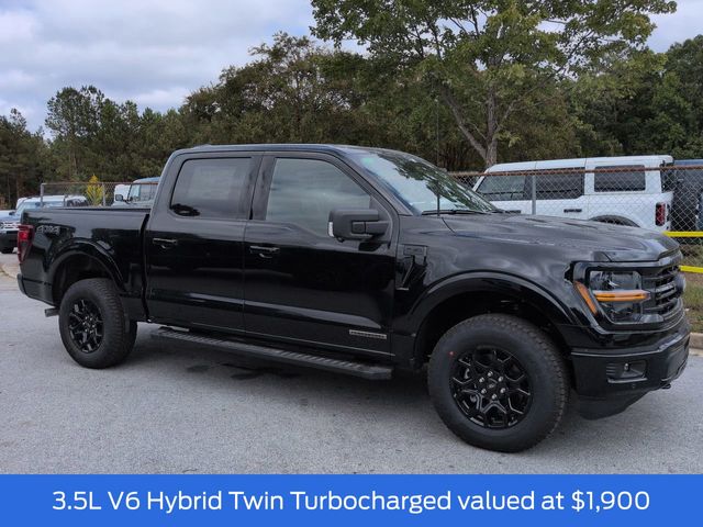 2025 Agate Black Metallic 2025 Ford F-150 XLT XLT 4D SuperCrew 4WD 3.5L PowerBoost Full-Hybrid V6 4D SuperCrew, 3.5L PowerBoost Full-Hybrid V6, 10-Speed Automatic, 4WD, 12" LCD Productivity Touchscreen, 360 Degree Camera, 400W Cab & Bed Outlets, 6" Angular Bright Anodized Step Bar, Adaptive Cruise Control w/Stop & Go, Auto Emergency Braking, Auto LED Headlights, Auto-Dimming Rear-View Mirror, Backup Camera, Black Painted Grille w/Chrome Center Bar, Blind Spot Monitoring, BLIS w/ Cross Traffic Alert, Bluetooth w/ Audio Streaming, Chrome Door & Tailgate Handles, Chrome Single-Tip Exhaust, Cloth 40/Console/40 Front Seats, Connected Navigation, Console Worksurface, Driver State Detection, Dual-Zone Electronic Automatic Temperature Control, Equipment Group 302A Mid, Evasive Steering Assist, Ford Co-Pilot360 Assist 2.0, Front Parking Sensors, Heated Front Seats, Integrated Trailer Brake Controller, Intelligent Access w/Push Button Start, Lane Keeping System, Mobile Office Package, Parking Sensors, Partitioned Lockable Rear Storage, Post Collision Braking, Power Glass Heated Sideview Mirrors, Power Mirror Package, Power Package, Power Sliding Rear Window, Power-Sliding Rear Window, Remote Start System w/Remote Tailgate Release, Reverse Brake Assist, Reverse Sensing, Tow Package, Tow/Haul Package, Towing Technology, Trailer Package, Wireless Charging Pad, Wrapped Steering Wheel, XLT Package. Equipment Group 302A Mid (360 Degree Camera, 400W Cab & Bed Outlets, 6" Angular Bright Anodized Step Bar, Adaptive Cruise Control w/Stop & Go, Auto-Dimming Rear-View Mirror, Black Painted Grille w/Chrome Center Bar, Chrome Door & Tailgate Handles, Chrome Single-Tip Exhaust, Cloth 40/Console/40 Front Seats, Connected Navigation, Driver State Detection, Dual-Zone Electronic Automatic Temperature Control, Evasive Steering Assist, Ford Co-Pilot360 Assist 2.0, Front Parking Sensors, Heated Front Seats, Intelligent Access w/Push Button Start, Power Glass Heated Sideview Mirrors, Power-Sliding Rear Window, Remote Start System w/Remote Tailgate Release, Towing Technology, and Wrapped Steering Wheel), Mobile Office Package (Console Worksurface and Partitioned Lockable Rear Storage), Tow/Haul Package (Integrated Trailer Brake Controller), 4D SuperCrew, 3.5L PowerBoost Full-Hybrid V6, 10-Speed Automatic, 4WD, 12" LCD Productivity Touchscreen, Auto Emergency Braking, Auto LED Headlights, Backup Camera, Blind Spot Monitoring, BLIS w/ Cross Traffic Alert, Bluetooth w/ Audio Streaming, Lane Keeping System, Parking Sensors, Post Collision Braking, Power Mirror Package, Power Package, Power Sliding Rear Window, Reverse Brake Assist, Reverse Sensing, Tow Package, Trailer Package, Wireless Charging Pad, XLT Package, 3.31 Axle Ratio, 4-Wheel Disc Brakes, 6 Speakers, ABS brakes, Air Conditioning, Alloy wheels, AM/FM radio: SiriusXM with 360L, Auto High-beam Headlights, BlueCruise (Equipment + 1-Year Plan), Brake assist, Bumpers: chrome, Chrome wheels, Cloth 40/20/40 Front Seat, Compass, Delay-off headlights, Driver door bin, Driver vanity mirror, Dual front impact airbags, Dual front side impact airbags, Electronic Locking w/3.73 Axle Ratio, Electronic Stability Control, Emergency communication system: SYNC 4 911 Assist, Front anti-roll bar, Front Center Armrest, Front fog lights, Front reading lights, Front wheel independent suspension, Fully automatic headlights, Heated door mirrors, Illuminated entry, Low tire pressure warning, Occupant sensing airbag, Outside temperature display, Overhead airbag, Overhead console, Panic alarm, Passenger door bin, Passenger vanity mirror, Power door mirrors, Power steering, Power windows, Radio data system, Radio: AM/FM Stereo w/SiriusXM 360L, Rear Parking Sensors, Rear reading lights, Rear step bumper, Rear window defroster, Remote keyless entry, Security system, Speed control