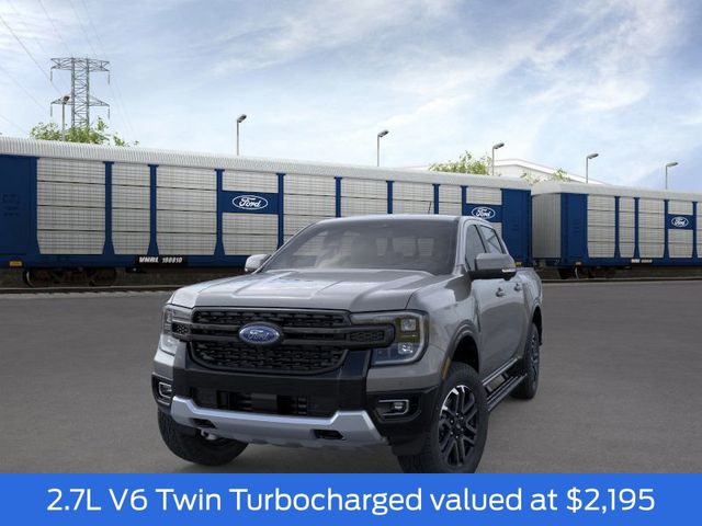 2025 Carbonized Gray Metallic 2025 Ford Ranger Lariat Lariat 4D Crew Cab 4WD 2.7L EcoBoost V6 4WD. FX4 Off-Road Package (FX4 Off-Road Box Decal, FX4 Selectable Drive Modes, Off-Road Screen in Center Stack, Off-Road Tuned Shocks, and Trail Control), Sport Appearance Package (Gray Painted Center Bar & Grille Surround, Gray Painted Front Fascia & Rear Bumper, and Sport Box Decal), Trailer Tow Package (Class IV Trailer Hitch Receiver), 4WD, 10 Speakers, 4-Wheel Disc Brakes, ABS brakes, Air Conditioning, Alloy wheels, AM/FM radio: SiriusXM, Auto High-beam Headlights, Auto-dimming Rear-View mirror, Automatic temperature control, Black Running Boards, Brake assist, Compass, Delay-off headlights, Driver door bin, Driver vanity mirror, Dual front impact airbags, Dual front side impact airbags, Electronic Stability Control, Emergency communication system: SYNC 4 911 Assist, Front anti-roll bar, Front Bucket Seats, Front Center Armrest, Front dual zone A/C, Front fog lights, Front reading lights, Front wheel independent suspension, Fully automatic headlights, Garage door transmitter, Heated door mirrors, Heated front seats, Heated steering wheel, Illuminated entry, Leather Shift Knob, Leather steering wheel, Leather-Trimmed Front Heated Bucket Seats, Low tire pressure warning, Memory seat, Navigation system: Connected Navigation, Occupant sensing airbag, Outside temperature display, Overhead airbag, Overhead console, Panic alarm, Passenger door bin, Passenger vanity mirror, Power door mirrors, Power driver seat, Power passenger seat, Power steering, Power windows, Radio: B&O Sound System by Bang & Olufsen, Rain sensing wipers, Rear reading lights, Rear seat center armrest, Rear step bumper, Rear window defroster, Remote keyless entry, Security system, SiriusXM Satellite Radio, Speed control, Speed-sensing steering, Steering wheel mounted audio controls, SYNC 4A w/Connected Navigation, Telescoping steering wheel, Tilt steering wheel, Traction control, Trip computer, Turn signal indicator mirrors, Variably intermittent wipers, Voltmeter, and Wheels: 18" Machined Aluminum w/Dark Pockets.