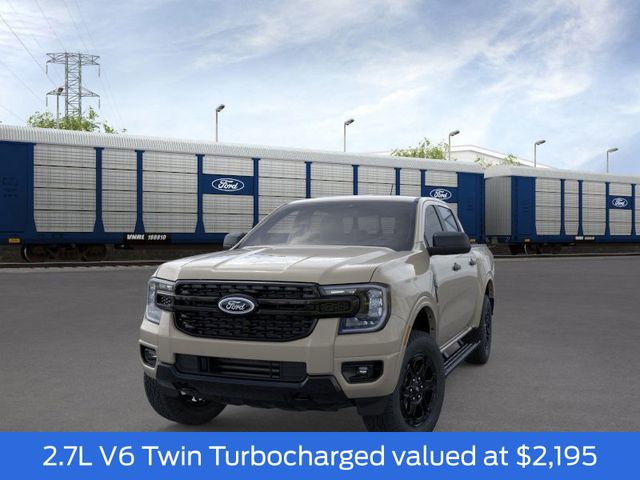 2025 Desert Sand 2025 Ford Ranger XLT XLT 4D Crew Cab 4WD 2.7L EcoBoost V6 4WD. Black Appearance Package (Black Center Bar & Surround Grille, Black Rear Bumper, Body-Color Painted Front Fascia, Front & Rear Black Ford Ovals, Painted Body-Color Wheel Lip Molding, Unique Carpet Mats, and Wheels: 18" Black Painted), FX4 Off-Road Package (FX4 Off-Road Box Decal, FX4 Selectable Drive Modes, Off-Road Screen in Center Stack, Off-Road Tuned Shocks, and Trail Control), Sport Appearance Package (Gray Painted Center Bar & Grille Surround, Gray Painted Front Fascia & Rear Bumper, and Sport Box Decal), Trailer Tow Package (Class IV Trailer Hitch Receiver), 4WD, 4-Wheel Disc Brakes, 6 Speakers, ABS brakes, Air Conditioning, Alloy wheels, AM/FM radio: SiriusXM, AM/FM Stereo, Auto High-beam Headlights, Auto-dimming Rear-View mirror, Black Running Boards, Brake assist, Cloth Front Bucket Seats, Compass, Delay-off headlights, Driver door bin, Driver vanity mirror, Dual front impact airbags, Dual front side impact airbags, Electronic Stability Control, Emergency communication system: SYNC 4 911 Assist, Front anti-roll bar, Front Bucket Seats, Front Center Armrest, Front fog lights, Front reading lights, Front wheel independent suspension, Fully automatic headlights, Illuminated entry, Leather Shift Knob, Low tire pressure warning, Navigation system: Connected Navigation, Occupant sensing airbag, Outside temperature display, Overhead airbag, Overhead console, Panic alarm, Passenger door bin, Passenger vanity mirror, Power door mirrors, Power steering, Power windows, Rear reading lights, Rear seat center armrest, Rear step bumper, Rear window defroster, Remote keyless entry, Security system, SiriusXM Satellite Radio, Speed control, Speed-sensing steering, Steering wheel mounted audio controls, SYNC 4A w/Connected Navigation, Telescoping steering wheel, Tilt steering wheel, Traction control, Trip computer, Variably intermittent wipers, Voltmeter, and Wheels: 17" Gray-Painted Aluminum.