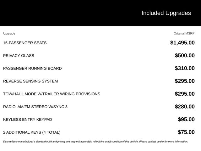 2025 Oxford White 2025 Ford Transit-350 XL XL Passenger Van RWD 3.5L V6 Flex Fuel Passenger Van, 3.5L V6 Flex Fuel, 10-Speed Automatic with Overdrive, RWD, 15-Passenger Seats, 3.73 Limited-Slip Axle Ratio, 4G WiFi Hotspot Telematics, Auto LED Headlights, Backup Camera, Hill Start Assist, Lane Keeping System, Order Code 301A, Parking Sensors, Power Mirror Package, Power Package, Pre Collision Assist w/ AEB, Preferred Equipment Package, Pro Trailer Hitch Assist, Reverse Sensing, Tow Package, Trailer Package. Order Code 301A, Passenger Van, 3.5L V6 Flex Fuel, 10-Speed Automatic with Overdrive, RWD, 15-Passenger Seats, 3.73 Limited-Slip Axle Ratio, 4G WiFi Hotspot Telematics, Auto LED Headlights, Backup Camera, Hill Start Assist, Lane Keeping System, Parking Sensors, Power Mirror Package, Power Package, Pre Collision Assist w/ AEB, Preferred Equipment Package, Pro Trailer Hitch Assist, Reverse Sensing, Tow Package, Trailer Package, 2 Additional Keys (4 Total), 3rd row seats: split-bench, 4-Wheel Disc Brakes, 4th-Row Bench Seat, 8 Speakers, ABS brakes, Air Conditioning, AM/FM radio, Auto High-beam Headlights, Brake assist, Cloth Front Bucket Seats, Dark Palazzo Gray Cloth Bucket Seats, Delay-off headlights, Driver door bin, Driver vanity mirror, Driver's Seat Mounted Armrest, Dual front impact airbags, Dual front side impact airbags, Electronic Air Temperature Control, Electronic Stability Control, Front anti-roll bar, Front Bucket Seats, Front Fog Lamps, Front License Plate Bracket, Front reading lights, Front Sensing System, Front wheel independent suspension, Fully automatic headlights, Illuminated entry, Keyless Entry Keypad, Large Center Console, Low tire pressure warning, Occupant sensing airbag, Overhead airbag, Panic alarm, Passenger door bin, Passenger Running Board, Passenger seat mounted armrest, Passenger vanity mirror, Power door mirrors, Power steering, Power windows, Privacy Glass, Radio: AM/FM Stereo w/SYNC 4 & Nav, Rain sensing wipers, Rear air conditioning, Rear window defroster, Rear-Window Defroster, Remote keyless entry, Reverse Sensing System, Side Sensing System, Speed control, Steering wheel mounted audio controls, Tachometer, Telescoping steering wheel, Tilt steering wheel, Tow/Haul Mode w/Trailer Wiring Provisions, Traction control, Variably intermittent wipers, and Wheels: 16" Steel w/Full Silver Cover. $1,000 - Exp. 12/31/2026 Retail Trade Assistance. Must trade in a vehicle to qualify $1,000 - Exp. 12/31/2026 Dealer Finance Assistance. Must finance through dealer lender to qualify.