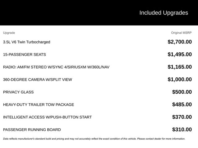 2025 Oxford White 2025 Ford Transit-350 XL 15-Passenger XL Passenger Van RWD EcoBoost 3.5L V6 GTDi DOHC 24V Twin Turbocharged Passenger Van, EcoBoost 3.5L V6 GTDi DOHC 24V Twin Turbocharged, 10-Speed Automatic with Overdrive, RWD, 3.73 Limited-Slip Axle Ratio, 360-Degree Camera, 4G WiFi Hotspot Telematics, Auto Emergency Braking, Backup Camera, Electronic Air Temperature Control, Foward Collison Alert, Hill Start Assist, Lane Keeping System, Parking Sensors, Post Collision Braking, Pre Collision Assist w/ AEB, Preferred Equipment Package, Pro Trailer Hitch Assist, Radio: AM/FM Stereo w/SYNC 4 & Nav, Rain sensing wipers, Rain Sensing Wipers, Rear air conditioning, Rear window defroster, Reverse Brake Assist, Reverse Sensing, Side-Wind Stabilization, Tow Package, Trailer Package. Passenger Van, EcoBoost 3.5L V6 GTDi DOHC 24V Twin Turbocharged, 10-Speed Automatic with Overdrive, RWD, 3.73 Limited-Slip Axle Ratio, 360-Degree Camera, 4G WiFi Hotspot Telematics, Auto Emergency Braking, Backup Camera, Electronic Air Temperature Control, Foward Collison Alert, Hill Start Assist, Lane Keeping System, Parking Sensors, Post Collision Braking, Pre Collision Assist w/ AEB, Preferred Equipment Package, Pro Trailer Hitch Assist, Radio: AM/FM Stereo w/SYNC 4 & Nav, Rain sensing wipers, Rain Sensing Wipers, Rear air conditioning, Rear window defroster, Reverse Brake Assist, Reverse Sensing, Side-Wind Stabilization, Tow Package, Trailer Package, 3rd row seats: split-bench, 4-Wheel Disc Brakes, 4th-Row Bench Seat, 8 Speakers, ABS brakes, Air Conditioning, AM/FM radio, Auto High-beam Headlights, Brake assist, Cloth Front Bucket Seats, Dark Palazzo Gray Cloth Bucket Seats, Delay-off headlights, Driver door bin, Driver vanity mirror, Driver's Seat Mounted Armrest, Dual front impact airbags, Dual front side impact airbags, Electronic Stability Control, Front anti-roll bar, Front Bucket Seats, Front Fog Lamps, Front reading lights, Front Sensing System, Front wheel independent suspension, Fully automatic headlights, Illuminated entry, Large Center Console, Low tire pressure warning, Occupant sensing airbag, Overhead airbag, Panic alarm, Passenger door bin, Passenger seat mounted armrest, Passenger vanity mirror, Power door mirrors, Power steering, Power windows, Remote keyless entry, Reverse Sensing System, Side Sensing System, Speed control, Steering wheel mounted audio controls, Tachometer, Telescoping steering wheel, Tilt steering wheel, Traction control, and Wheels: 16" Steel w/Full Silver Cover. $1,000 - Exp. 12/31/2026 Retail Trade Assistance. Must trade in a vehicle to qualify $1,000 - Exp. 12/31/2026 Dealer Finance Assistance. Must finance through dealer lender to qualify.