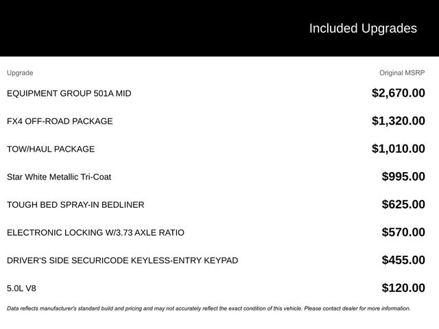 2026 Star White Metallic Tri-Coat 2026 Ford F-150 Lariat Lariat 4D SuperCrew 4WD 5.0L V8 4WD. Ford Connectivity Package (1-Year Included), Internet access capable: 5G Modem - Ford Connectivity Package, 4WD, 3.31 Axle Ratio, 4-Wheel Disc Brakes, 8 Speakers, ABS brakes, Air Conditioning, Alloy wheels, AM/FM radio: SiriusXM with 360L, Auto High-beam Headlights, Auto-dimming door mirrors, Auto-dimming Rear-View mirror, Automatic temperature control, Brake assist, Bumpers: chrome, Chrome wheels, Compass, Delay-off headlights, Driver door bin, Driver vanity mirror, Dual front impact airbags, Dual front side impact airbags, Electronic Stability Control, Emergency communication system: SYNC 4 911 Assist, Front anti-roll bar, Front Bucket Seats, Front Center Armrest, Front dual zone A/C, Front fog lights, Front reading lights, Front wheel independent suspension, Fully automatic headlights, Garage door transmitter, Heated door mirrors, Heated front seats, Heated steering wheel, Illuminated entry, Low tire pressure warning, Memory seat, Navigation system: Connected Navigation, Occupant sensing airbag, Outside temperature display, Overhead airbag, Overhead console, Panic alarm, Passenger door bin, Passenger vanity mirror, Power door mirrors, Power driver seat, Power passenger seat, Power steering, Power windows, Radio data system, Radio: B&O Sound System by Bang and Olufsen, Rain sensing wipers, Rear reading lights, Rear seat center armrest, Rear step bumper, Rear window defroster, Remote keyless entry, Security system, Speed control, Split folding rear seat, Steering wheel mounted audio controls, SYNC 4 with Enhanced Voice Recognition, Tachometer, Telescoping steering wheel, Tilt steering wheel, Traction control, Trip computer, Turn signal indicator mirrors, Variably intermittent wipers, Ventilated front seats, and Wheels: 18" Chrome-Like PVD. Price includes: $1,000 - Exp. 12/31/2026 Retail Trade Assistance. Must trade in a vehicle to qualify $1,000 - Exp. 12/31/2026 Dealer Finance Assistance. Must finance through dealer lender to qualify.