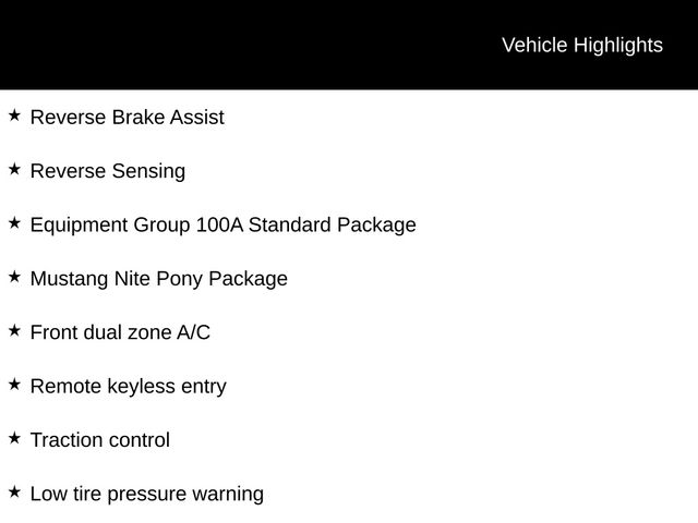 2026 Carbonized Gray Metallic 2026 Ford Mustang EcoBoost EcoBoost 2D Coupe RWD EcoBoost 2.3L I4 GTDi DOHC Turbocharged VCT 2D Coupe, EcoBoost 2.3L I4 GTDi DOHC Turbocharged VCT, 10-Speed Automatic, RWD, 12.4" LCD Digital Driver Cluster, 13.2" LCD Centerstack Touchscreen, ABS brakes, Alloy wheels, Auto LED Headlights, Backup Camera, Black Mirror Caps, Black Painted Wedge Decklid Spoiler, Compass, Electronic Stability Control, Equipment Group 100A Standard Package, Front dual zone A/C, Illuminated entry, Low tire pressure warning, Mustang Nite Pony Package, Painted Black Roof, Parking Sensors, Power Mirror Package, Power Package, Push Button Start, Remote keyless entry, Reverse Brake Assist, Reverse Sensing, Traction control, Wheels: 19" x 8.5" Ebony Black-Painted Aluminum. Equipment Group 100A Standard Package (AM/FM Stereo, Cloth Bucket Seats, and SYNC 4), Mustang Nite Pony Package (Black Mirror Caps, Black Painted Wedge Decklid Spoiler, Painted Black Roof, and Wheels: 19" x 8.5" Ebony Black-Painted Aluminum), 2D Coupe, EcoBoost 2.3L I4 GTDi DOHC Turbocharged VCT, 10-Speed Automatic, RWD, 12.4" LCD Digital Driver Cluster, 13.2" LCD Centerstack Touchscreen, ABS brakes, Alloy wheels, Auto LED Headlights, Backup Camera, Compass, Electronic Stability Control, Front dual zone A/C, Illuminated entry, Low tire pressure warning, Parking Sensors, Power Mirror Package, Power Package, Push Button Start, Remote keyless entry, Reverse Brake Assist, Reverse Sensing, Traction control, 4-Wheel Disc Brakes, 6 Speakers, Air Conditioning, AM/FM radio, Auto High-beam Headlights, Automatic temperature control, Brake assist, Bumpers: body-color, Delay-off headlights, Driver door bin, Driver vanity mirror, Dual front impact airbags, Dual front side impact airbags, Emergency communication system: 911 Assist, Exterior Parking Camera Rear, Four wheel independent suspension, Front anti-roll bar, Front Bucket Seats, Front Center Armrest, Front reading lights, Fully automatic headlights, Knee airbag, Leather Shift Knob, Occupant sensing airbag, Outside temperature display, Overhead airbag, Overhead console, Panic alarm, Passenger door bin, Passenger vanity mirror, Power door mirrors, Power steering, Power windows, Radio data system, Rain sensing wipers, Rear anti-roll bar, Rear Parking Sensors, Rear window defroster, Speed control, Speed-sensing steering, Speed-Sensitive Wipers, Split folding rear seat, Sport steering wheel, Steering wheel mounted audio controls, Tachometer, Telescoping steering wheel, Tilt steering wheel, Trip computer, and Voltmeter. Price includes: $1,000 - Exp. 12/31/2026 Retail Trade Assistance. Must trade in a vehicle to qualify $1,000 - Exp. 12/31/2026 Dealer Finance Assistance. Must finance through dealer lender to qualify.