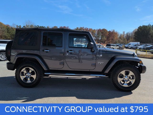 This 2018 Jeep Wrangler JK Unlimited Sahara in Granite Crystal Metallic Clearcoat features: 4D Sport Utility, 3.6L V6 24V VVT, 5-Speed Automatic, 4WD, 18" x 7.5" Polished Satin Carbon Wheels, 4-Wheel Disc Brakes, 8 Speakers, ABS brakes, AM/FM radio: SiriusXM, Auto LED Headlights, Auto-dimming Rear-View mirror, Backup Camera, Body Color Appliques Front Bumper, Body Color Appliques Rear Bumper, Body Color/Accent Color Grille, Brake assist, Cloth Seats w/Adjustable Head Restraints, Command-Trac Shift-on-the-Fly Part-Time 4WD, Compass, Connectivity Group, Electronic Stability Control, Front Bucket Seats, Front Center Armrest w/Storage, Front fog lights, Front Seat Back Map Pockets, Fully automatic headlights, Heated door mirrors, Heavy Duty Suspension w/Gas Shocks, Hill Descent Control, Hill Start Assist, Illuminated entry, Integrated roll-over protection, Leather steering wheel, LED Foglights, Low tire pressure warning, Next Generation Dana 30 Solid Front Axle, Next Generation Dana 44 Heavy Duty Rear Axle, Off Road Package, Outside temperature display, Panic alarm, Power door mirrors, Power Mirror Package, Power Package, Power steering, Power windows, Preferred Equipment Package, Quick Order Package 24G, Radio data system, Remote keyless entry, Security system, Skid Plate Package, Speed control, Split folding rear seat, Steering wheel mounted audio controls, Suspension Package, Tilt steering wheel, Tire Pressure Monitoring Display, Traction control, Trip computer, Uconnect Voice Command w/Bluetooth, Variably intermittent wipers, Vehicle Information Center.