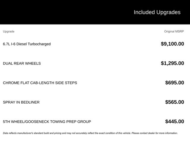 This 2019 Ram 3500 Big Horn in Bright White Clearcoat features: 4D Crew Cab, Cummins 6.7L I6 Turbodiesel, 6-Speed Automatic, 4WD, 2 Way Rear Headrest Seat, 4 Way Front Headrests, 4-Wheel Disc Brakes, 5th Wheel/Gooseneck Towing Prep Group, 6 Speakers, 6000# Front Axle w/Hub Ext, ABS brakes, Active Noise Control System, Air Conditioning, AM/FM radio, Backup Camera, Box & Rear Fender Clearance Lamps, Brake assist, Bright Wheel Skins, Center Stack Storage Drawer, Clearance Lamps, Compass, Delay-off headlights, Electronic Stability Control, Electronically Controlled Throttle, Front Armrest w/Cupholders, Front Bumper Sight Shields, Front Center Armrest w/Storage, Fully automatic headlights, Heated door mirrors, Hill Start Assist, Illuminated entry, Low tire pressure warning, Manual Adjust 4-Way Front Passenger Seat, Multimedia Package, Outside temperature display, Overhead console, Panic alarm, ParkView Rear Back-Up Camera, Power door mirrors, Power Mirror Package, Power Package, Power steering, Power windows, Preferred Equipment Package, Push Button Start, Quick Order Package 2HZ Big Horn, Radio data system, Radio: Uconnect 3 w/5" Display, Rear Folding Seat, Rear seat center armrest, Rear step bumper, Rear Wheelhouse Liners, Remote keyless entry, Remote Start, Speed control, Spray In Bedliner, Tilt steering wheel, Tip Start, Tire Pressure Monitoring Delete, Tow Package, Traction control, Trailer Package, Trip computer, Turn signal indicator mirrors, Variably intermittent wipers, Wheels: 17" x 6.0" Steel Chrome Clad, Wheels: 18" x 8.0" Steel Chrome Clad.