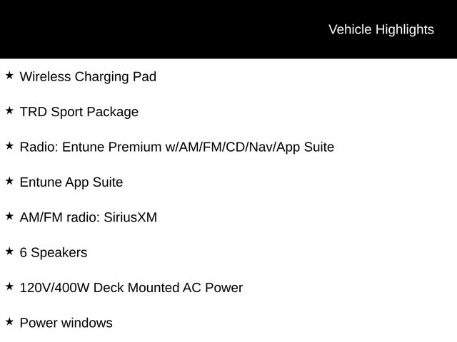 Inside, you'll find a wealth of advanced technology and convenience features, including the Entune Premium audio system with navigation, wireless charging, and Toyota Safety Sense. The spacious cabin offers ample room for passengers and cargo, while the power sliding rear window provides easy access to the truck bed.