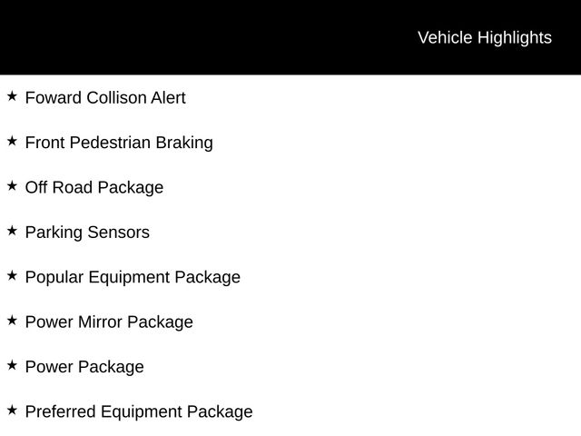 - Adaptive Cruise Control, Android Auto, Apple CarPlay, Backup Camera, Blind Spot Monitoring, Bluetooth w/ Audio Streaming, Cold Weather Package, Convenience Package, Foward Collison Alert, Front Pedestrian Braking, Off Road Package, Parking Sensors, Popular Equipment Package, Power Mirror Package, Power Package, Preferred Equipment Package, Premium Audio Package, Premium Sound Package, Rear Cross Traffic Alert, Reverse Brake Assist, Reverse Sensing, Safety Package, Skid Plate Package, Technology Package