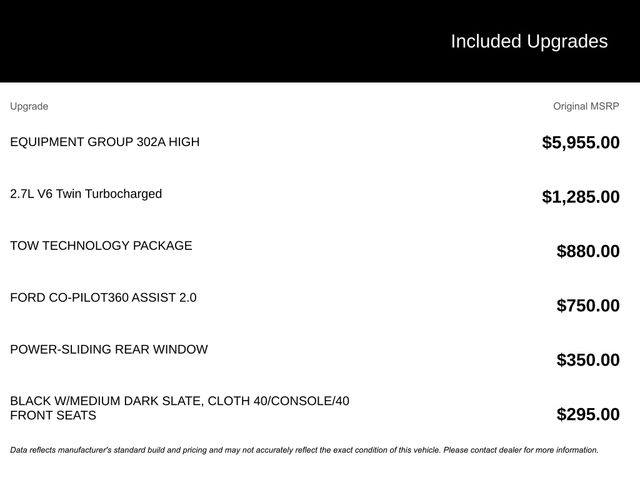 Elevate your driving experience with the premium features of the Equipment Group 302A High package, including the Tow Technology Package, Ford Co-Pilot360 Assist 2.0, and XLT Chrome Appearance Package. Enjoy the convenience of a 12-inch LCD touchscreen, wireless phone connectivity, and a 400-watt onboard power outlet.