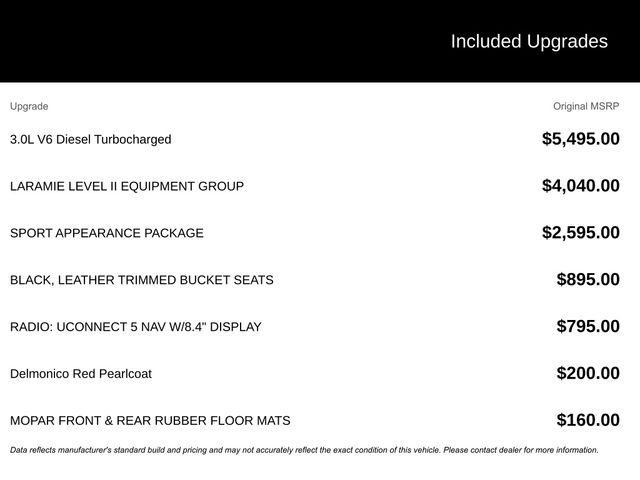 This 2022 Ram 1500 Laramie in Delmonico Red Pearlcoat features: 4D Crew Cab, EcoDiesel 3.0L V6, 8-Speed Automatic, RWD, **LOCAL TRADE**, 2nd Row In Floor Storage Bins, 3 Rear Seat Head Restraints, 4 Way Front Headrests, 4-Wheel Disc Brakes, 4G LTE Wi-Fi Hot Spot, 4G WiFi Hotspot Telematics, 8.4" Touchscreen Display, ABS brakes, Adjustable pedals, All Plant-Installed Decals, All R1 High Radios, All Radio Equipped Vehicles, Android Auto, Apple CarPlay, Apple Carplay, Apple CarPlay/Android Auto, Auto High Beam Headlamp Control, Auto LED Headlights, Auto-Dimming Exterior Driver Mirror, Auto-dimming Rear-View mirror, Automatic temperature control, Backup Camera, Black Interior Accents, Blind Spot & Cross Path Detection, Blind Spot Monitoring, Bluetooth w/ Audio Streaming, Body Color Door Handles, Body Color Exterior Mirrors, Body Color Front Bumper, Body Color Premium Power Mirrors, Body Color Rear Bumper w/Step Pads, Brake assist, Bucket Seats, Compass, Connected Travel & Traffic Services, Connectivity - US/Canada, Convex Wide-Angle Mirror Insert, Delay-off headlights, Delete LED Lamp - Floor Console Bin, Disassociated Touchscreen Display, Driver Seat Memory, Electronic Stability Control, Exterior Mirrors Courtesy Lamps, Exterior Mirrors w/Heating Element, Exterior Mirrors w/Memory, Exterior Mirrors w/Supplemental Signals, Exterior Parking Camera Rear, Foam Bottle Insert (Door Trim Panel), For Details, Visit DriveUconnect.com, For More Info, Call 800-643-2112, Front Center Armrest w/Storage, Front dual zone A/C, Front fog lights, Front Pedestrian Braking, Front Seat Back Map Pockets, Front wheel independent suspension, Full Length Upgraded Floor Console, Full Speed Auto Collision Warning Plus, Fully automatic headlights, Garage door transmitter, Global Telematics Box Module (TBM), Google Android Auto, GPS Antenna Input, GPS Navigation, Grille Surround 3 Body Color Tex 2 Black, harman/kardon 19 Speaker Premium Sound, HD Radio, Heated door mirrors, Heated Front Seats, Heated Steering Wheel, Illuminated entry, Integrated Center Stack Radio, Integrated Voice Command w/Bluetooth, Laramie Level II Equipment Group, Leather Seats, Leather steering wheel, Leather Trim 40/20/40 Bench Seat, Leather Trimmed Bucket Seats, LED Foglights, Low tire pressure warning, Memory seat, Navigation System, Outside temperature display, Overhead console, Panic alarm, Parking Sensors, ParkSense Front/Rear Park Assist w/Stop, Passenger door bin, Pedal memory, Power 2-Way Driver Lumbar Adjust, Power 2-Way Passenger Lumbar Adjust, Power 8-Way Driver & Passenger Seats, Power door mirrors, Power Mirror Package, Power Package, Power-Folding Mirrors, Preferred Equipment Package, Premium Audio Package, Premium Sound Package, Push Button Start, Quick Order Package 28H Laramie, Radio: Uconnect 5 Nav w/8.4" Display, Rain Sensitive Windshield Wipers, Rear 60/40 Folding Seat, Rear Cross Traffic Alert, Rear seat center armrest, Rear step bumper, Remote keyless entry, Remote Start, Remote Tailgate Release, Reverse Brake Assist, Reverse Sensing, Safety Package, Security system, SiriusXM Radio Service, SiriusXM w/360L, Speed control, Split folding rear seat, Sport Appearance Package, Sport Decal, Sport Performance Hood, Steering wheel mounted audio controls, Telescoping steering wheel, Tilt steering wheel, Tow Package, Traction control, Trailer Package, Trip computer, Turn signal indicator mirrors, Twill Film Appliques, USB Host Flip, Ventilated Front Seats, Ventilated front seats, Wheel to Wheel Side Steps, Wheels: 18" x 8" Aluminum Base Painted, Wheels: 20" x 9" Premium Painted w/Inserts, Wireless Charging Pad.