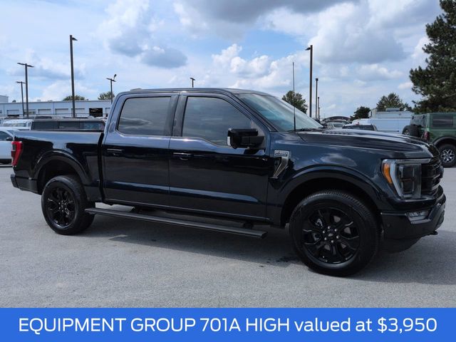 This 2023 Ford F-150 Platinum in Antimatter Blue Metallic features: 4D SuperCrew, 3.5L V6 EcoBoost, 10-Speed Automatic, 4WD, 12" LCD Productivity Touchscreen, 360 Degree Camera, 360-Degree Camera, 4-Wheel Disc Brakes, 4G WiFi Hotspot Telematics, ABS brakes, Adaptive Cruise Control, Adjustable pedals, AM/FM radio: SiriusXM with 360L, Auto Emergency Braking, Auto High-beam Headlights, Auto LED Headlights, Auto tilt-away steering wheel, Auto-dimming door mirrors, Auto-dimming Rear-View mirror, Automatic temperature control, Backup Camera, Bed Utility Package, Black Belt Moldings, Black Exterior Badging, Black Front Tow Hooks, Black Tailgate Applique, Black Taillamp Bezels, Blind Spot Monitoring, BLIS w/ Cross Traffic Alert, Bluetooth w/ Audio Streaming, Body-Color Door Handles & Mirror Caps, BoxLink, Brake assist, Class IV Trailer Hitch Receiver, Cold Weather Package, Compass, Dark Interior Appliques, Dark-Tinted Taillamps, Delay-off headlights, Electronic Locking w/3.55 Axle Ratio, Electronic Stability Control, Emergency communication system: SYNC 4 911 Assist, Equipment Group 701A High, Evasive Steering Assist, Extended Range 36 Gallon Fuel Tank, Exterior Parking Camera Rear, Ford BlueCruise 1.0, Front Center Armrest, Front dual zone A/C, Front fog lights, Front wheel independent suspension, Fully automatic headlights, Garage door transmitter, Heated door mirrors, Heated front seats, Heated steering wheel, Illuminated entry, Inclination/Intrusion Sensor Removal, Integrated Trailer Brake Controller, Lane Keeping System, Leather Seats, LED Box Lighting, LED Foglights, Low tire pressure warning, Max Trailer Tow Package, Memory Package, Memory seat, Outside temperature display, Overhead console, Panic alarm, Parallel and Perpendicular ParkAssist with Stop, Pedal memory, Platinum Black Appearance, Post Collision Braking, Power door mirrors, Power Mirror Package, Power Package, Power passenger seat, Power Running Boards, Power Tailgate, Power-Deployable Running Boards w/Black Accent, Pre Collision Assist w/ AEB, Premium Audio Package, Premium Sound Package, Pro Trailer Backup Assist & Pro Trailer Hitch Assist, Radio data system, Radio: B&O Unleashed Sound System by Bang & Olufsen, Rain sensing wipers, Rear seat center armrest, Rear step bumper, Remote keyless entry, Reverse Brake Assist, Reverse Sensing, Security system, Speed control, Speed-sensing steering, Split folding rear seat, Steering Wheel Heat Removal (DISC), Steering wheel memory, Steering wheel mounted audio controls, Tailgate Step w/Tailgate Work Surface, Telescoping steering wheel, Tilt steering wheel, Tough Bed Spray-In Bedliner, Tow Package, Traction control, Trailer Package, Turn signal indicator mirrors, Unique Hood & Grille w/Black Accent, Unique Multi-Contour Leather Bucket Seats, Ventilated front seats, Wheels: 20" Gloss Black Painted Aluminum.