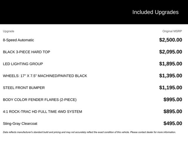 This 2023 Jeep Gladiator Rubicon in Sting-Gray Clearcoat features: 4D Crew Cab, 3.6L V6 24V VVT, 8-Speed Automatic, 4WD, **LOCAL TRADE**, 4-Wheel Disc Brakes, 4:1 RockTrac PartTime 4WD System, 4G WiFi Hotspot Telematics, 9 Speakers, ABS brakes, AM/FM radio: SiriusXM, Android Auto, Apple Carplay, Apple CarPlay/Android Auto, Auto LED Headlights, Auto-dimming Rear-View mirror, Automatic temperature control, Backup Camera, Black 3-Piece Hard Top, Bluetooth w/ Audio Streaming, Brake assist, Compass, Daytime Running Lamps LED Accents, Delay-off headlights, Electronic Stability Control, Emergency communication system, Freedom Panel Storage Bag, Front Center Armrest w/Storage, Front dual zone A/C, Front fog lights, Front LED Fog Lamps, Fully automatic headlights, Garage door transmitter, Heated door mirrors, Heavy-Duty Dana 44 Wide Axles, Illuminated entry, Integrated roll-over protection, LED Foglights, LED Lighting Group, LED Park Turn Lamps, LED Premium Reflector Headlamps, LED Taillamps, Low tire pressure warning, Off Road Package, Outside temperature display, Panic alarm, ParkView Rear Back-Up Camera, Performance Suspension, Power door mirrors, Power Mirror Package, Power Package, Power steering, Power windows, Preferred Equipment Package, Premium Audio Package, Premium Cloth Low-Back Bucket Seats, Premium Sound Package, Push Button Start, Quick Order Package 24R Rubicon, Radio data system, Radio: Uconnect 4C Nav w/8.4" Display, Rear Sliding Window, Rear Window Defroster, Remote keyless entry, Security system, Skid Plate Package, Split folding rear seat, Steel Front Bumper, Steering wheel mounted audio controls, Telescoping steering wheel, Tilt steering wheel, Traction control, Trip computer, Variably intermittent wipers, Wheels: 17" x 7.5" Machined/Painted Black.