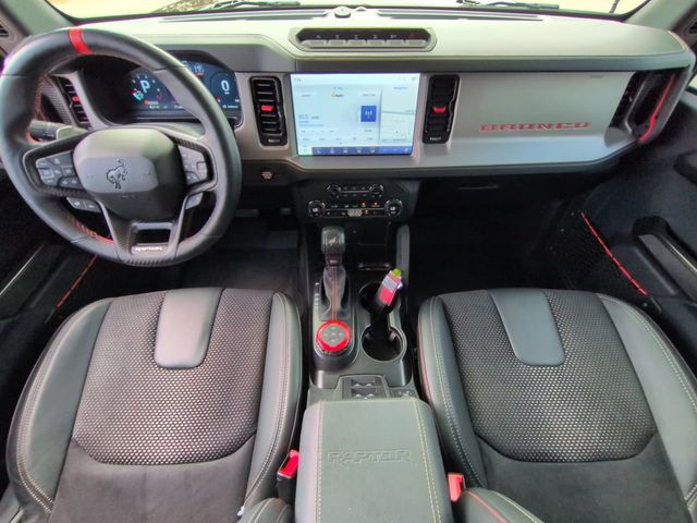 This 2024 Ford Bronco Raptor in Shelter Green Metallic features: 4D Sport Utility, 3.0L EcoBoost V6, 10-Speed Automatic, 4WD, **LOCAL TRADE**, 10 Speakers, 12" LCD Productivity Touchscreen, 360-Degree Camera, 5G WiFi Hotspot Telematics, Auto Emergency Braking, Auto LED Headlights, Backup Camera, Bluetooth w/ Audio Streaming, Connected Navigation, Convertible HardTop, Equipment Group 374A High/Lux Package, Fox Suspension, Front Row Top Panels Storage Bag, Glass rear window, Hard Top Sound Deadening Headliner, Hill Start Assist, Leather Seats, LED Foglights, Navigation system: Connected Navigation, Off Road Package, Performance Handling Package, Performance Package, Pre Collision Assist w/ AEB, Radio data system, Radio: B&O Sound System by Bang & Olufsen, Rear window wiper, Rear-Window Defroster & Washer, Shadow Black Painted Hard Top, SiriusXM Radio w/360L, Skid Plate Package, SYNC 4, Wheels: 17" Dark Carbonized Gray Alloy Painted.